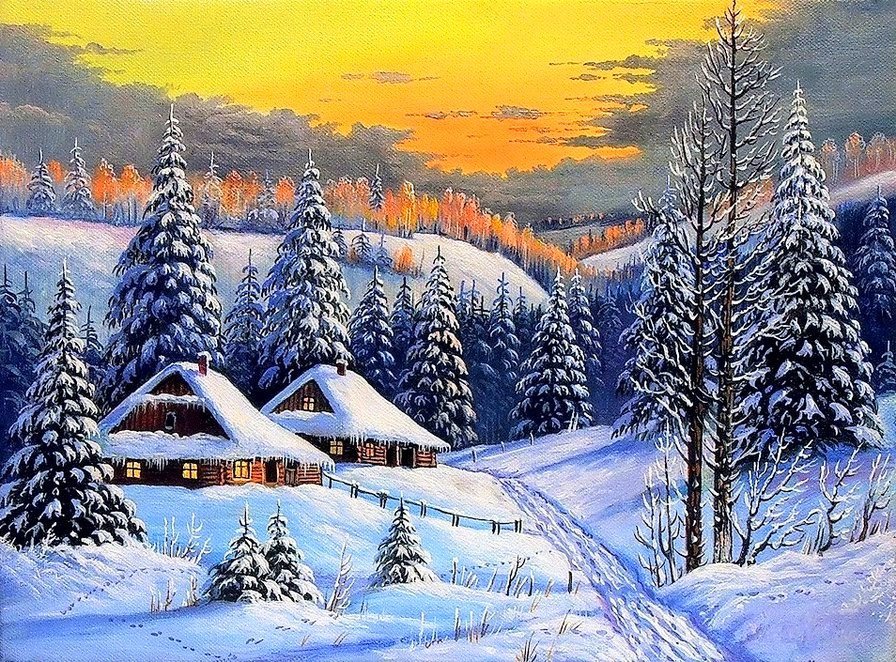 ![Зимний пейзаж с избой]()