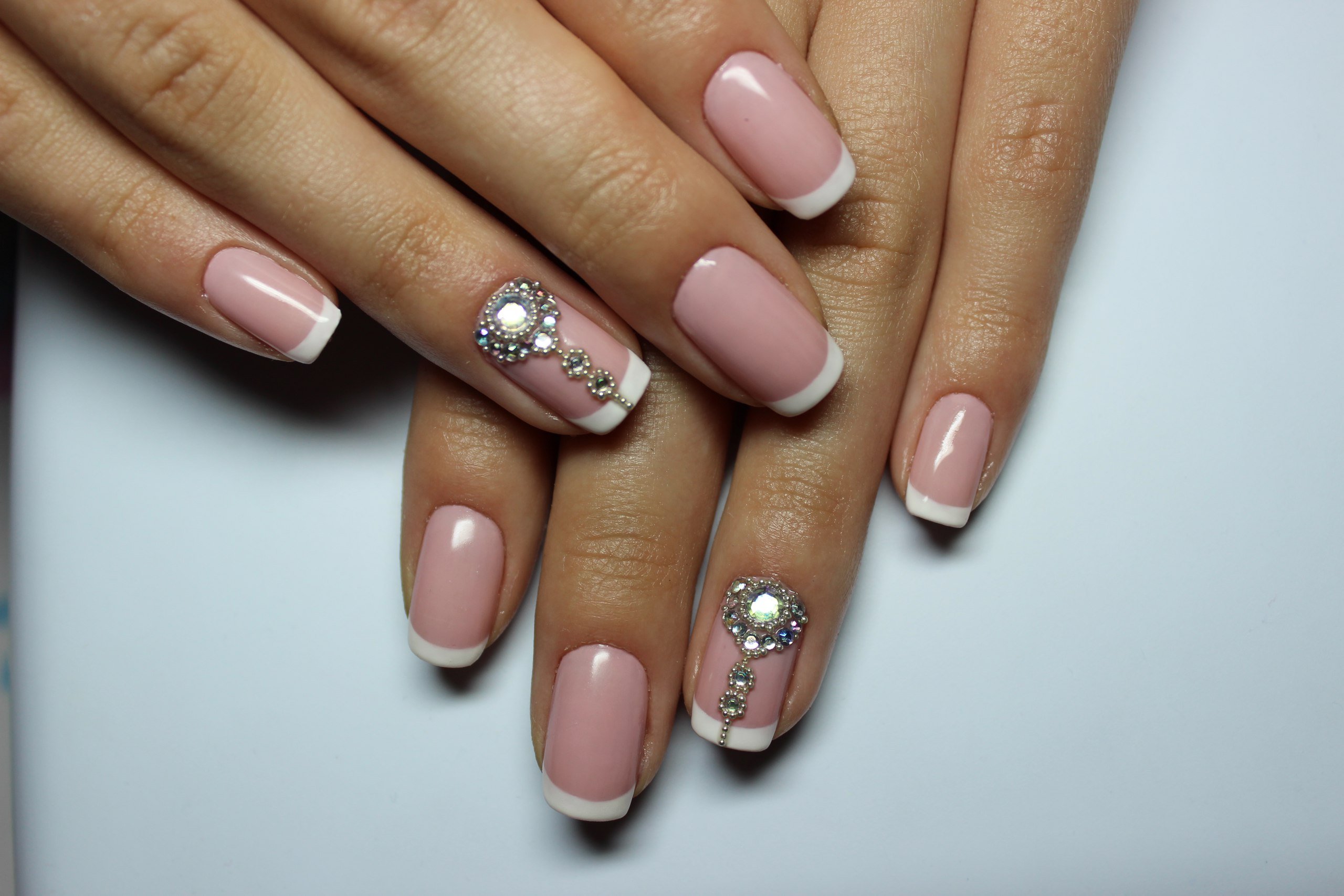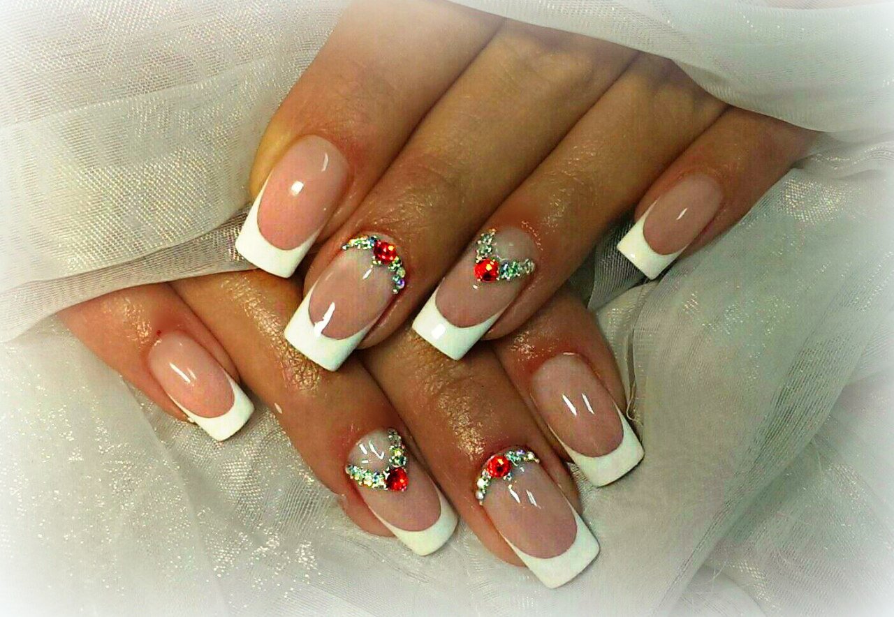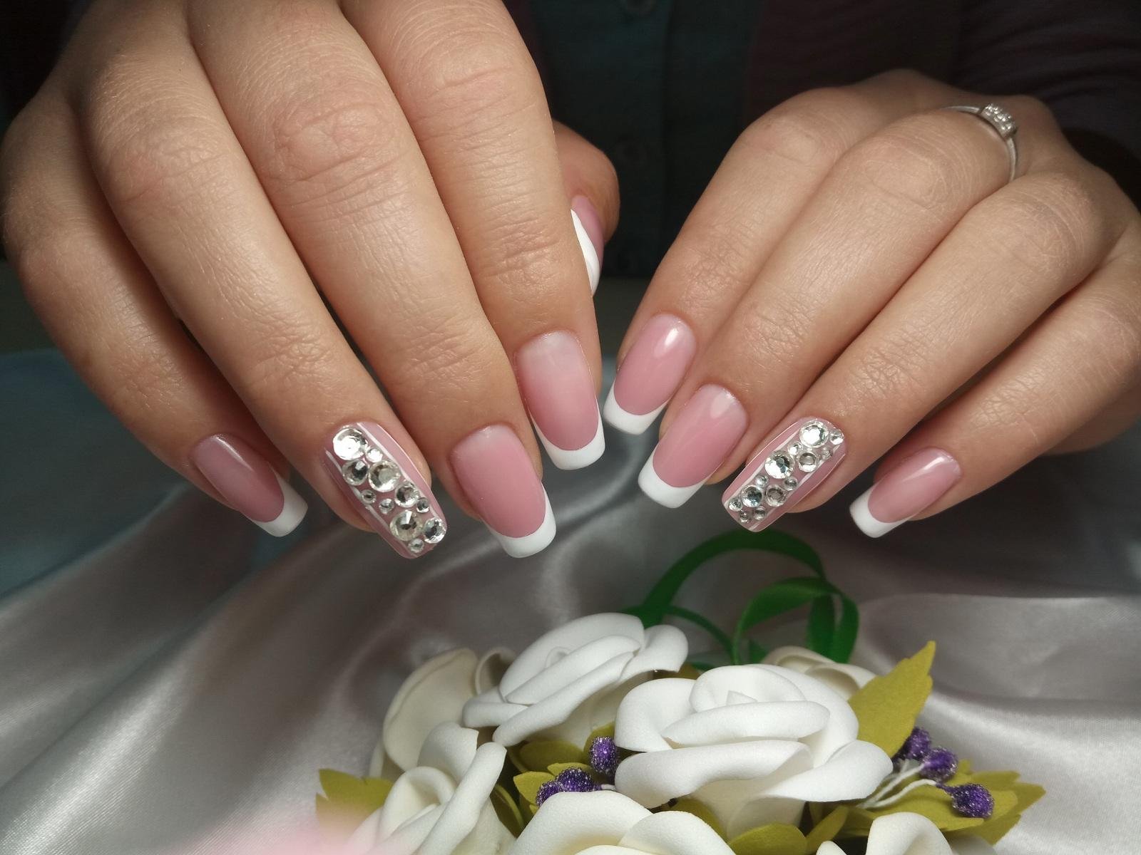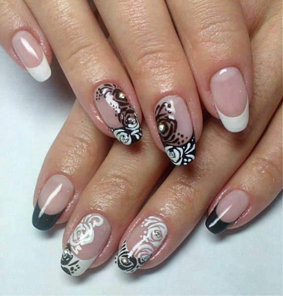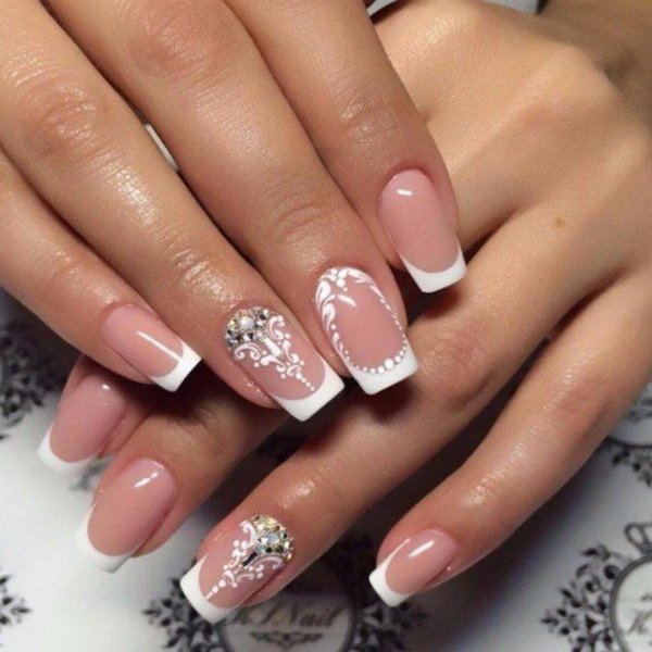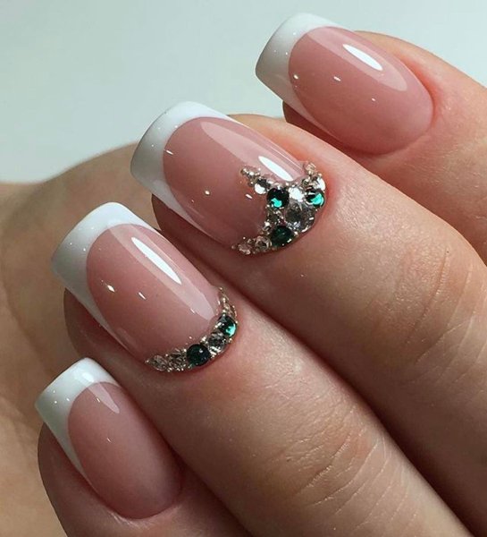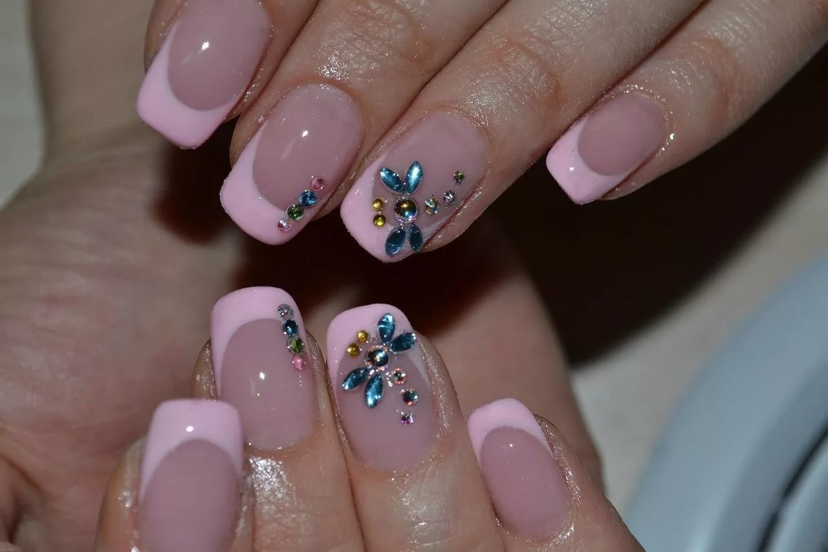 Красивый маникюр френч с рисунком и стразами - это идеальный выбор для тех, кто хочет добавить немного оригинальности и блеска своим ногтям. Этот стильный дизайн комбинирует классическую френч-технику с уникальными элементами рисунка и блестками. На кончиках ногтей создается четкая линия белого или нежного цвета, которая придает маникюру элегантность. А с помощью различных рисунков и наклеек, можно добавить индивидуальность и оригинальность этому образу. Дополнительно можно использовать стразы, чтобы придать ногтям еще больше блеска и привлечь внимание к вашим рукам. Такой маникюр отлично подходит как для повседневной носки, так и для особых случаев, ведь он всегда выглядит стильно, аккуратно и привлекательно.