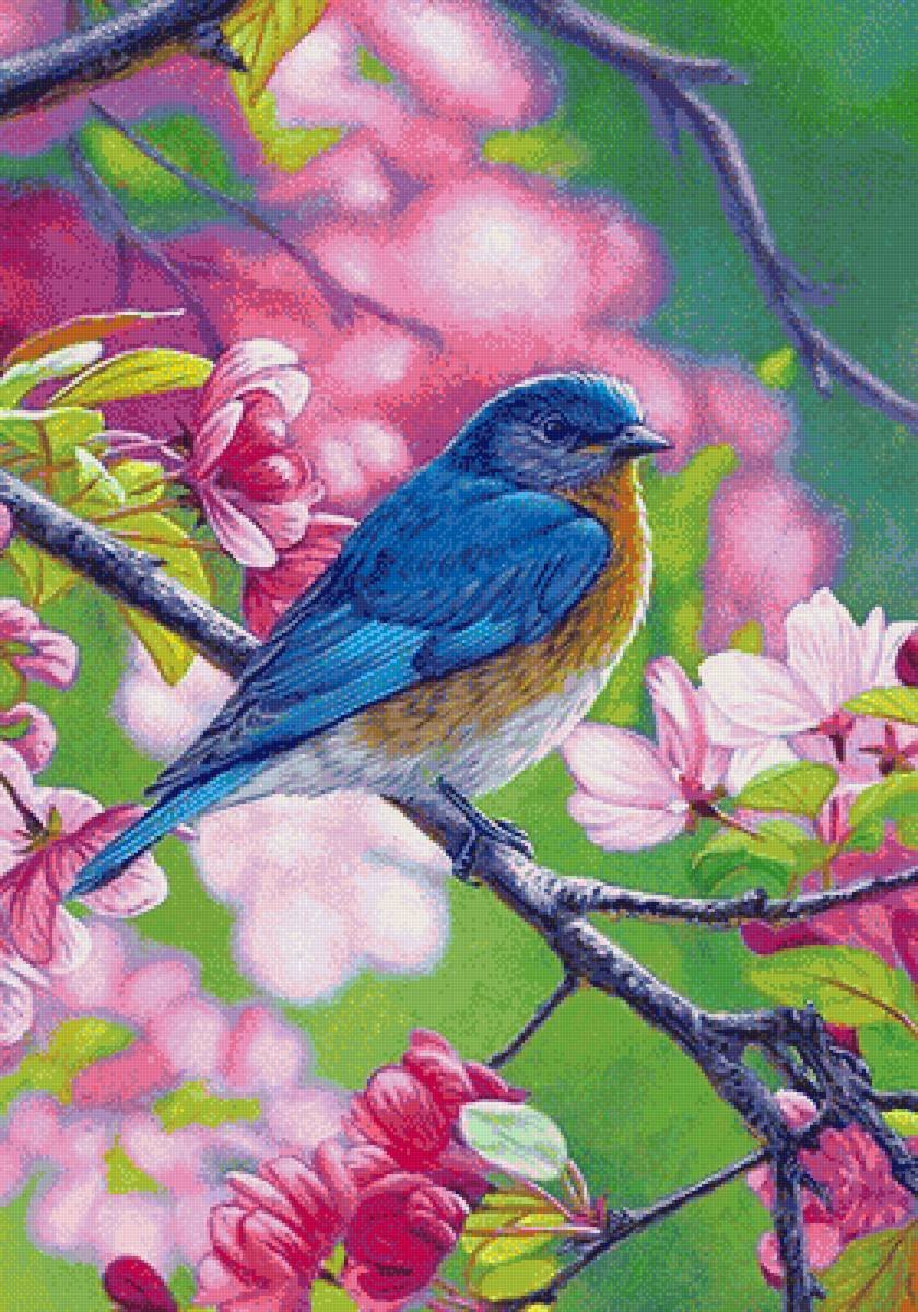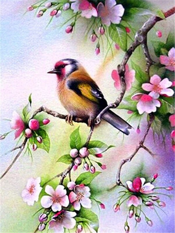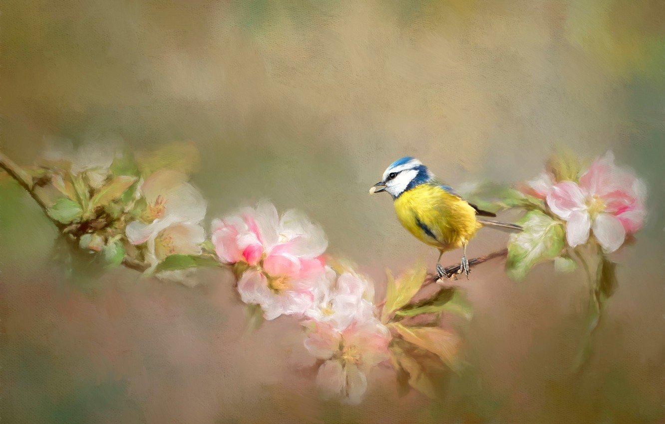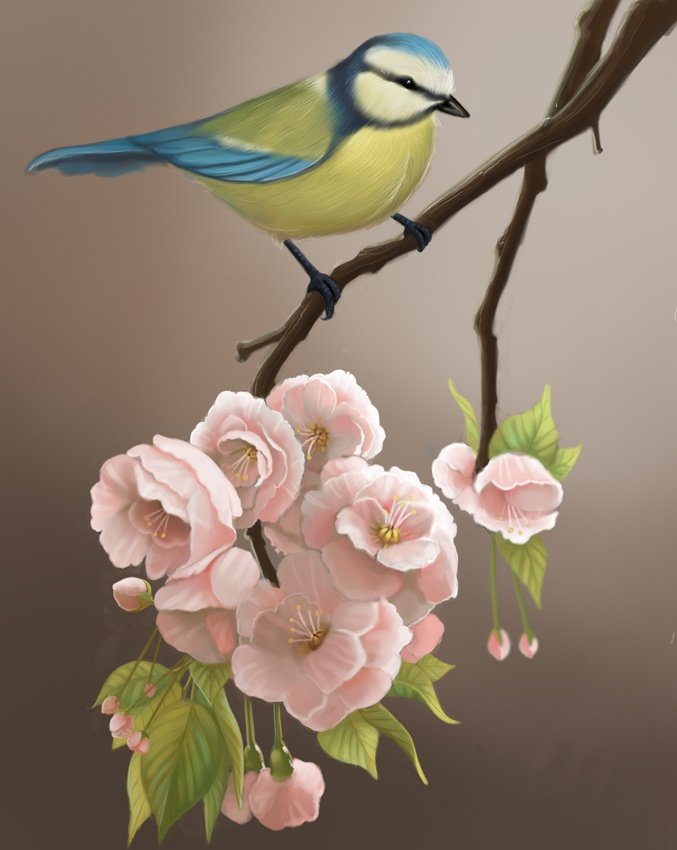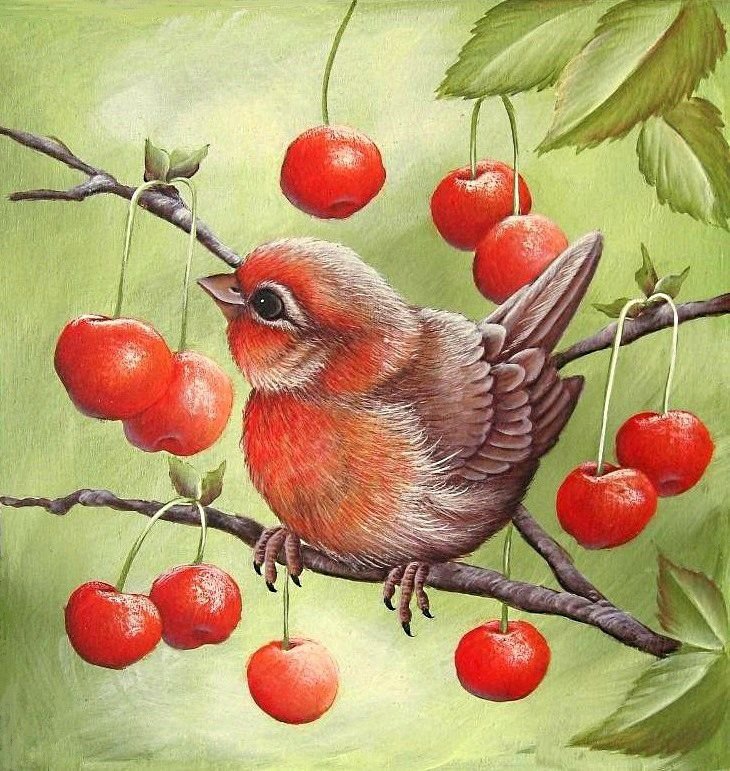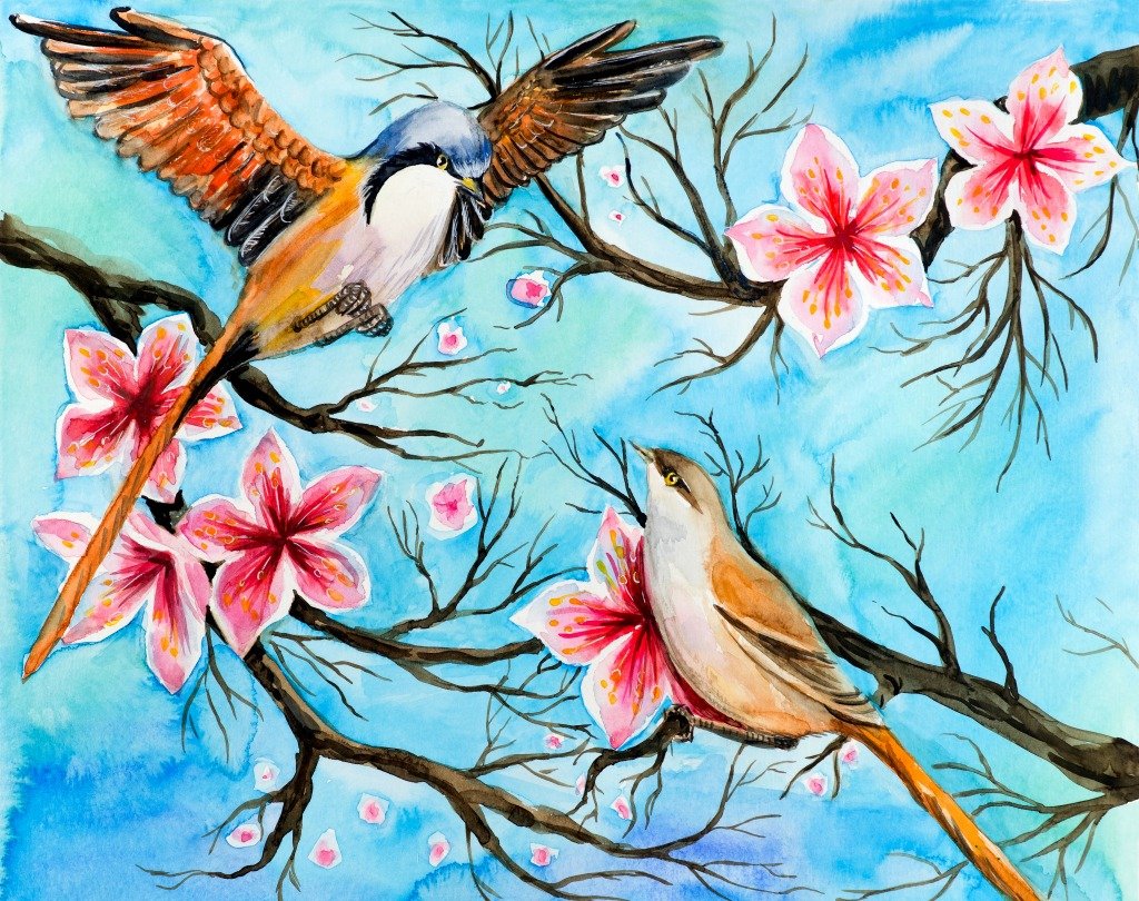 ![Птицы на цветущей ветке живопись]()