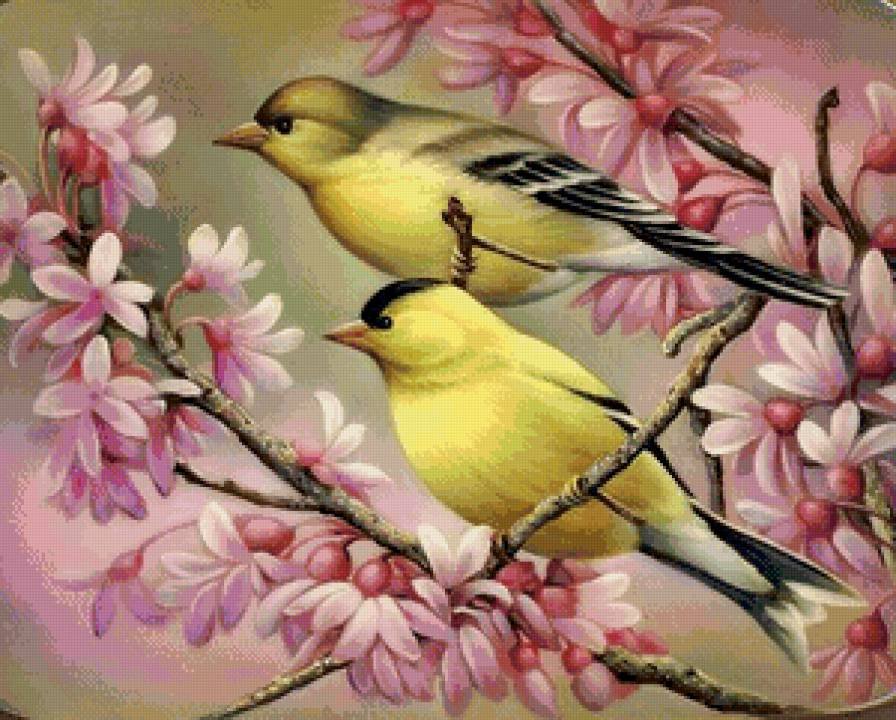 Птицы на цветущей ветке живопись