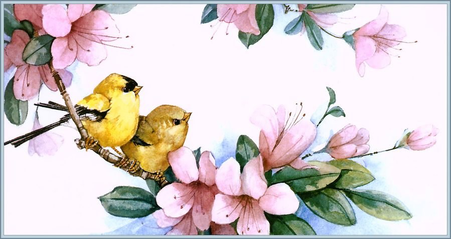 Весенние птички с цветами акварелью