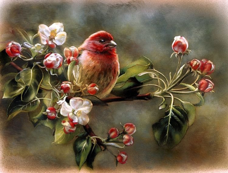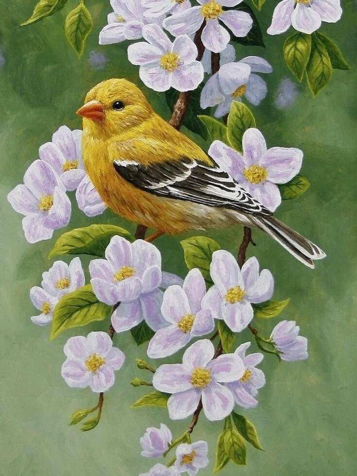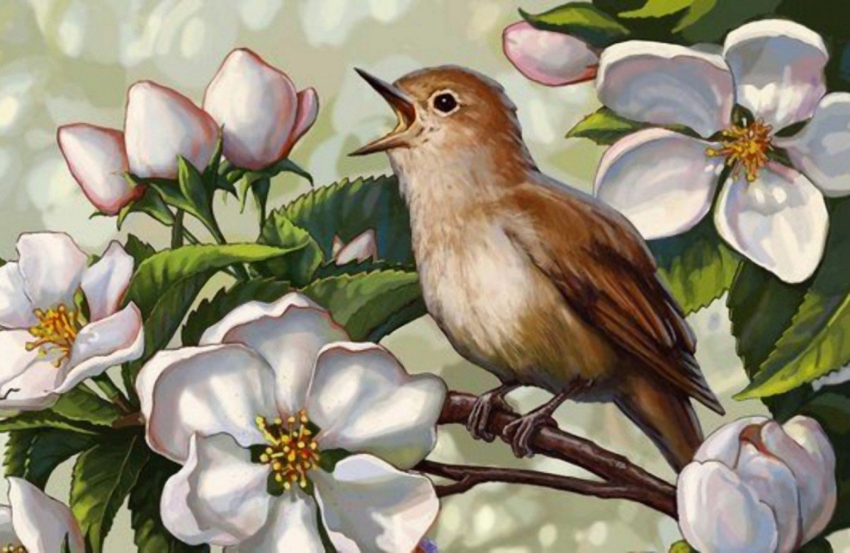 ![Птицы на цветущей ветке живопись]()