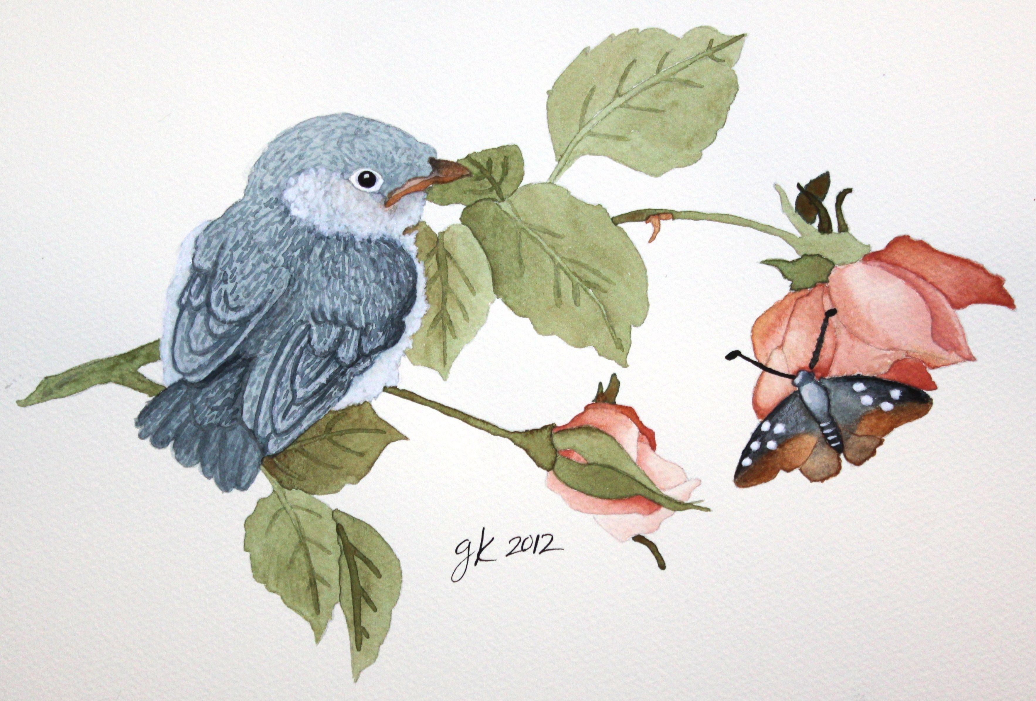 Цветы птицы акварелью