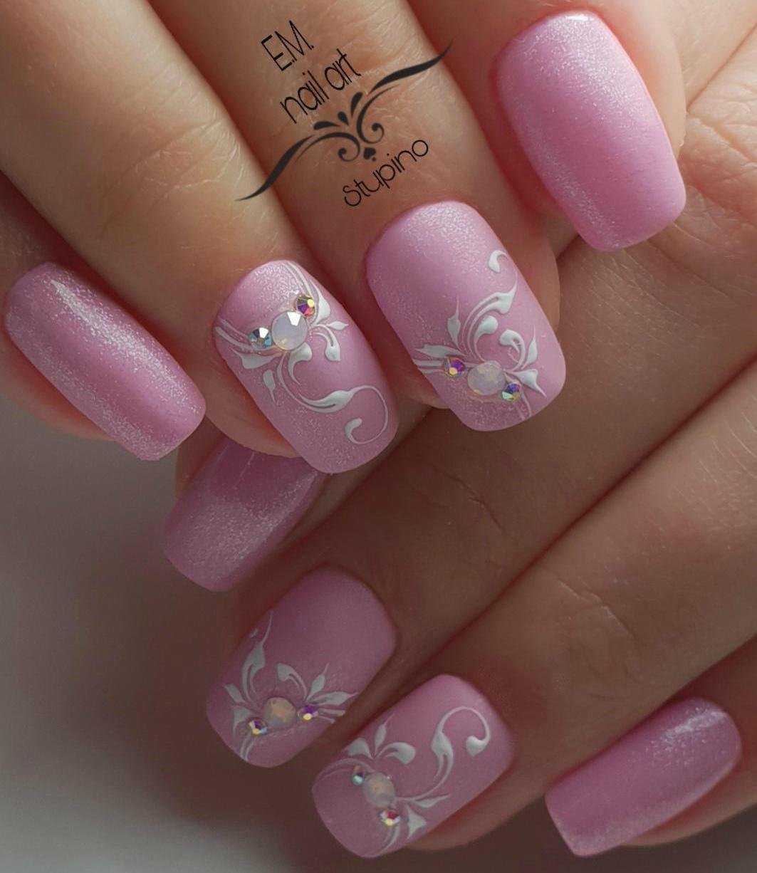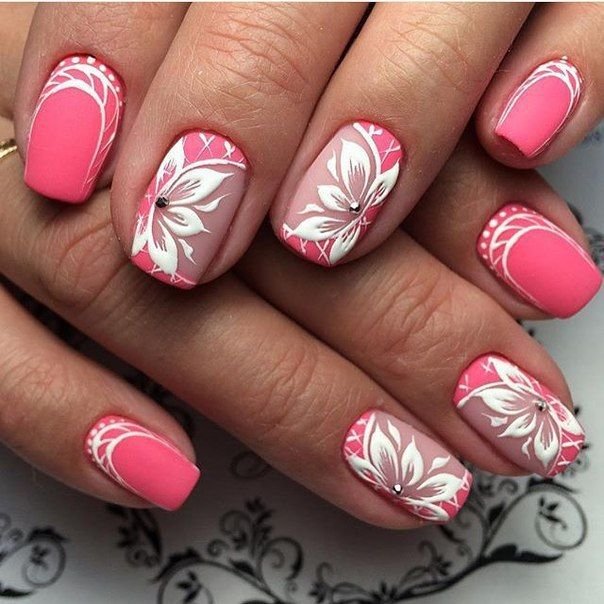 ![Ногти розовые с белым рисунком]()
