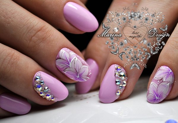 ![Маникюр с цветами и стразами]()