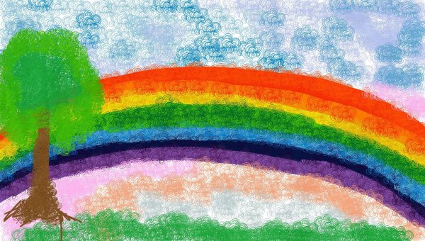 ![Пейзаж с радугой цветными карандашами]()