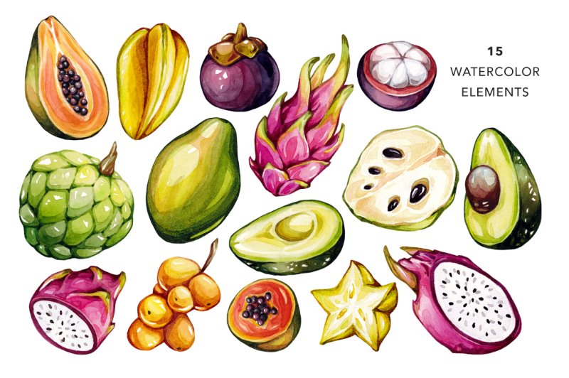 ![Экзотические фрукты акварелью]()