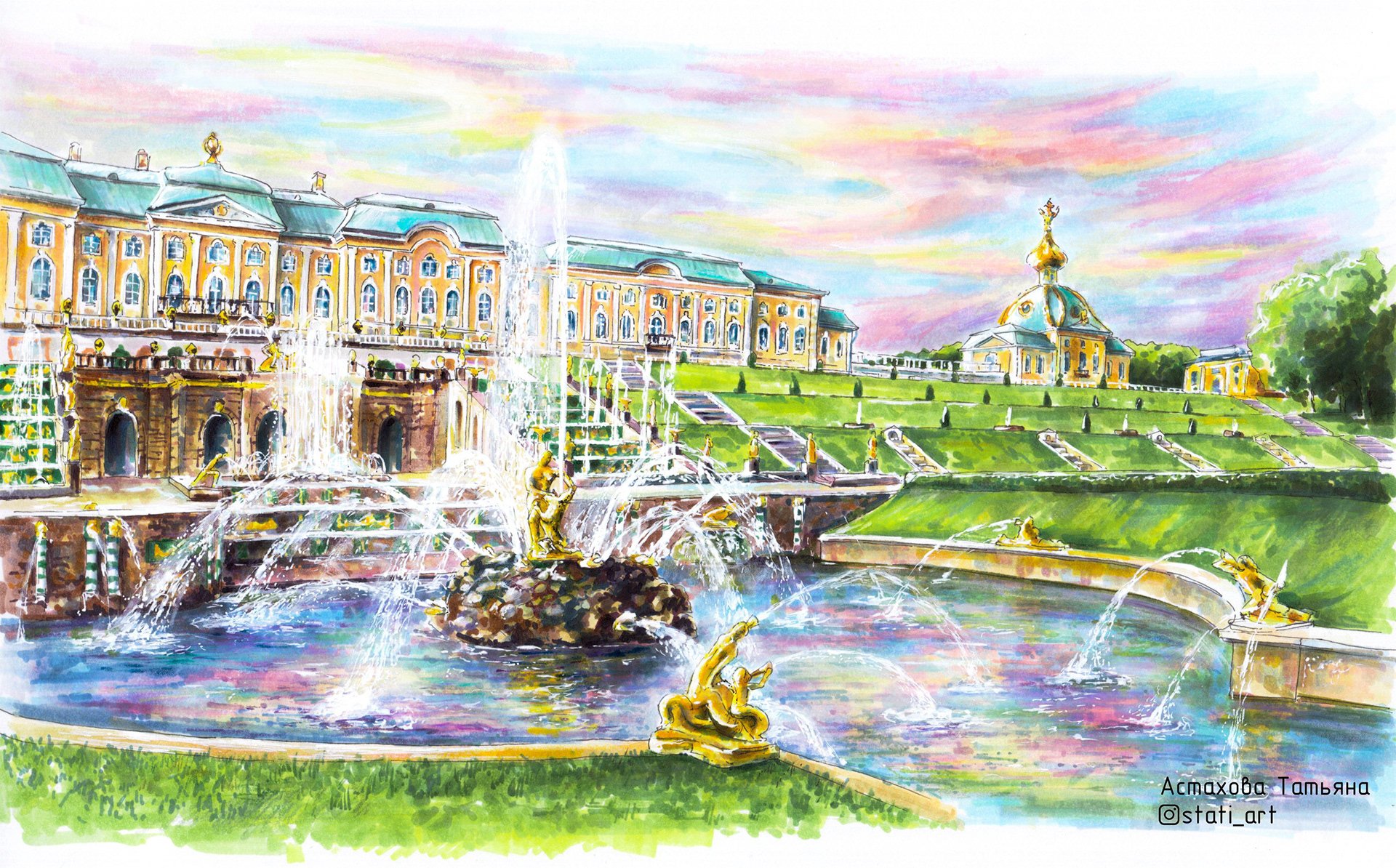 Петергоф фонтаны акварель