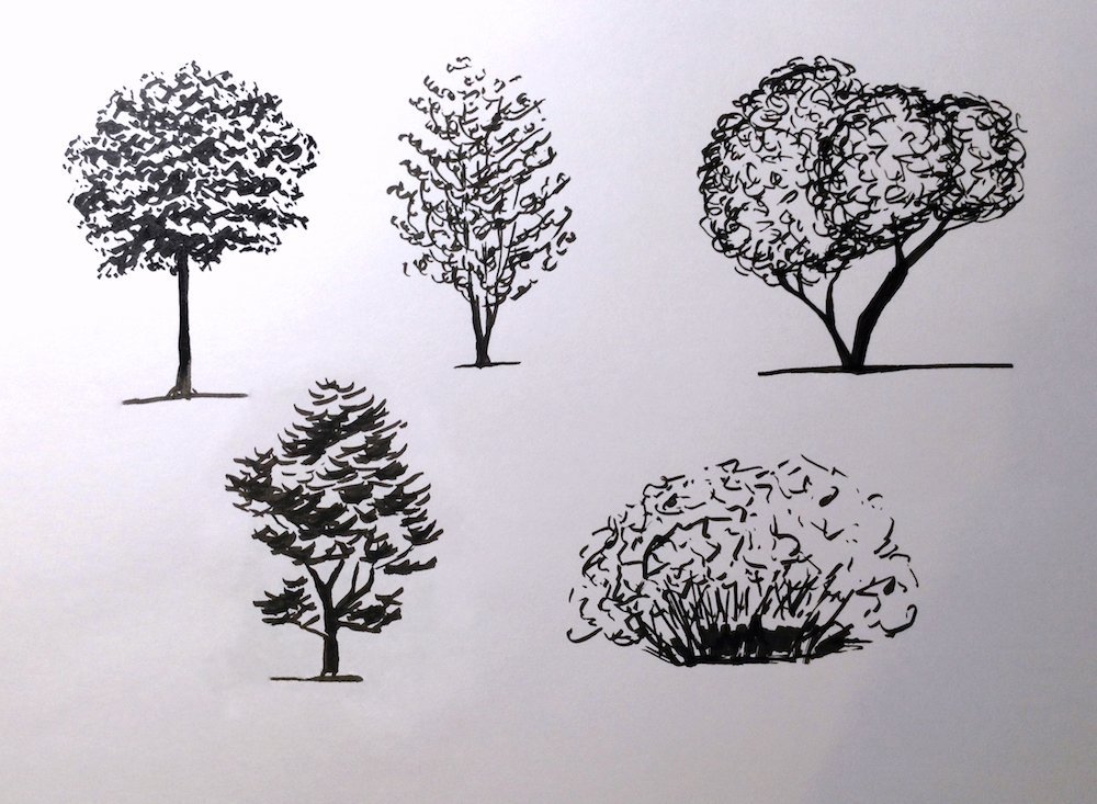 ![Деревья и кустарники карандашом]()