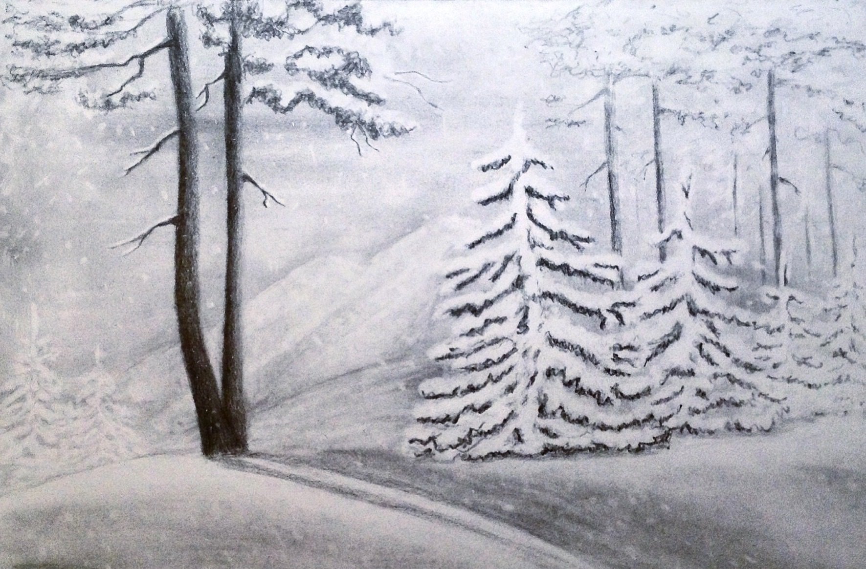 Зимний пейзаж с ёлками карандашом