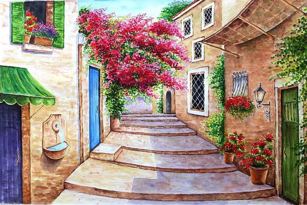 ![Южная улочка акварель]()