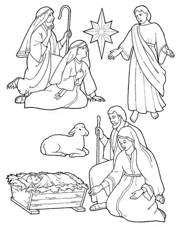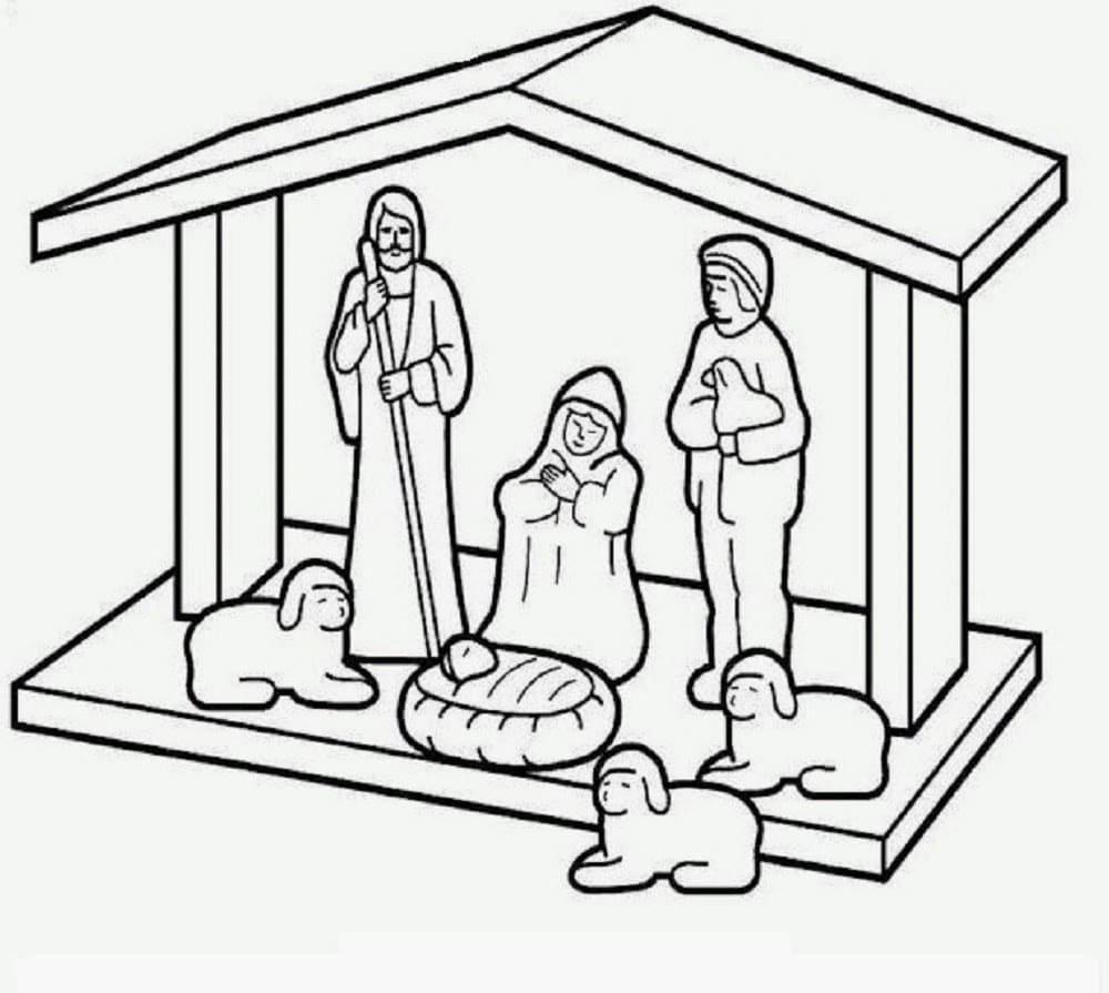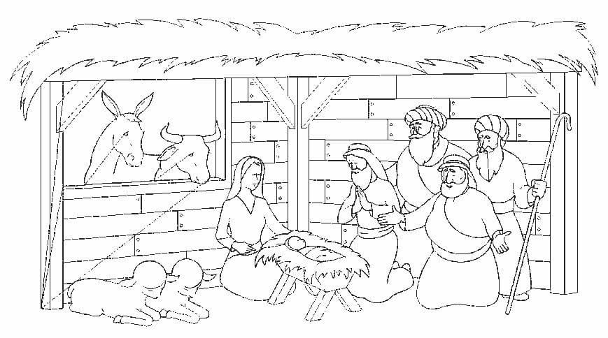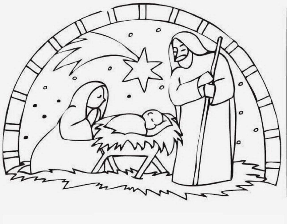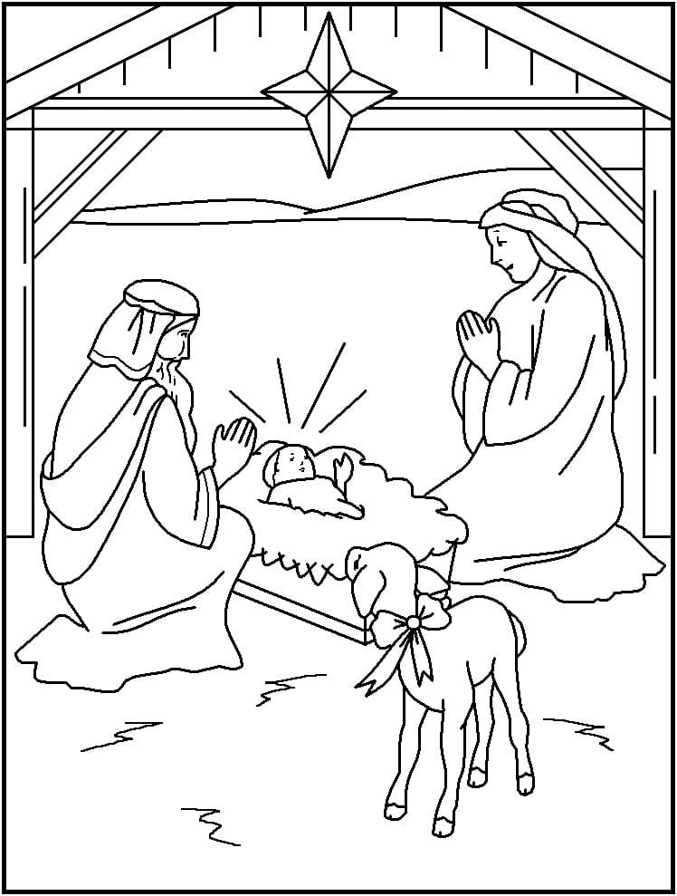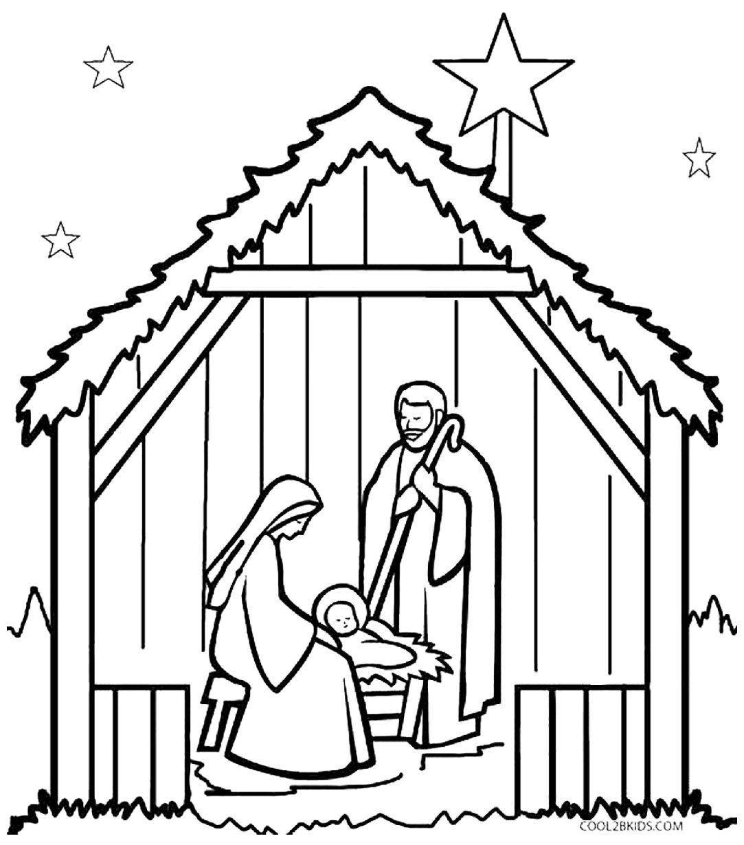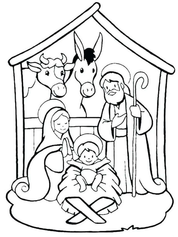 ![Мария, Иосиф и младенец в вертепе раскраска]()