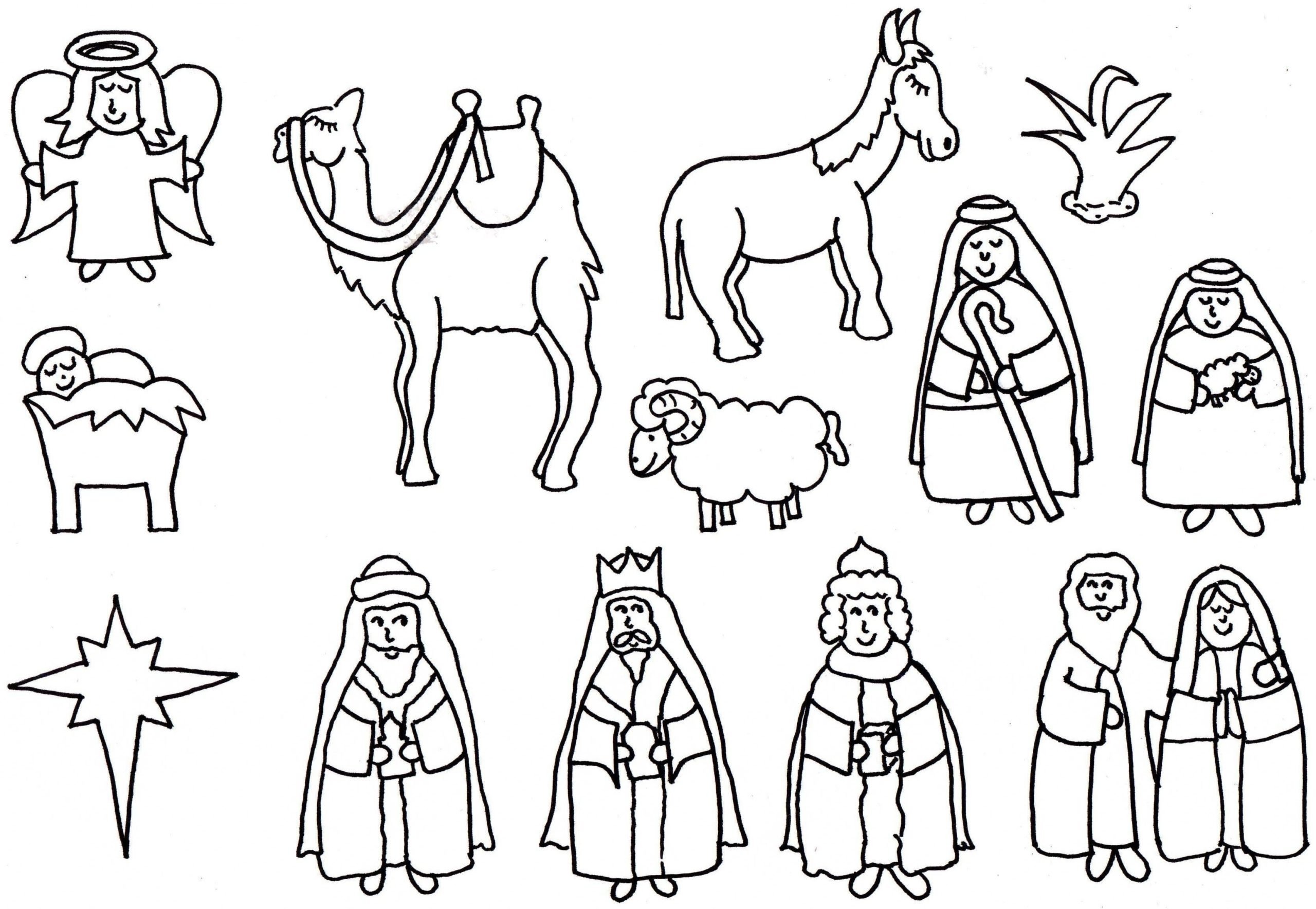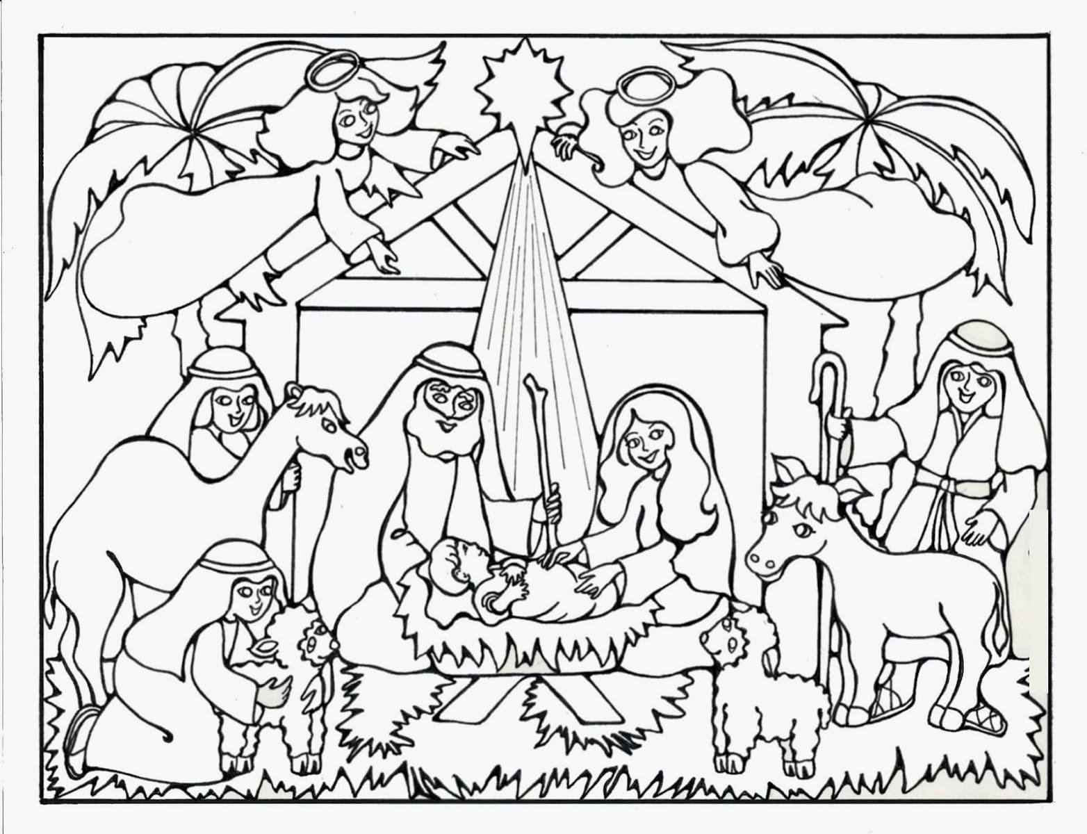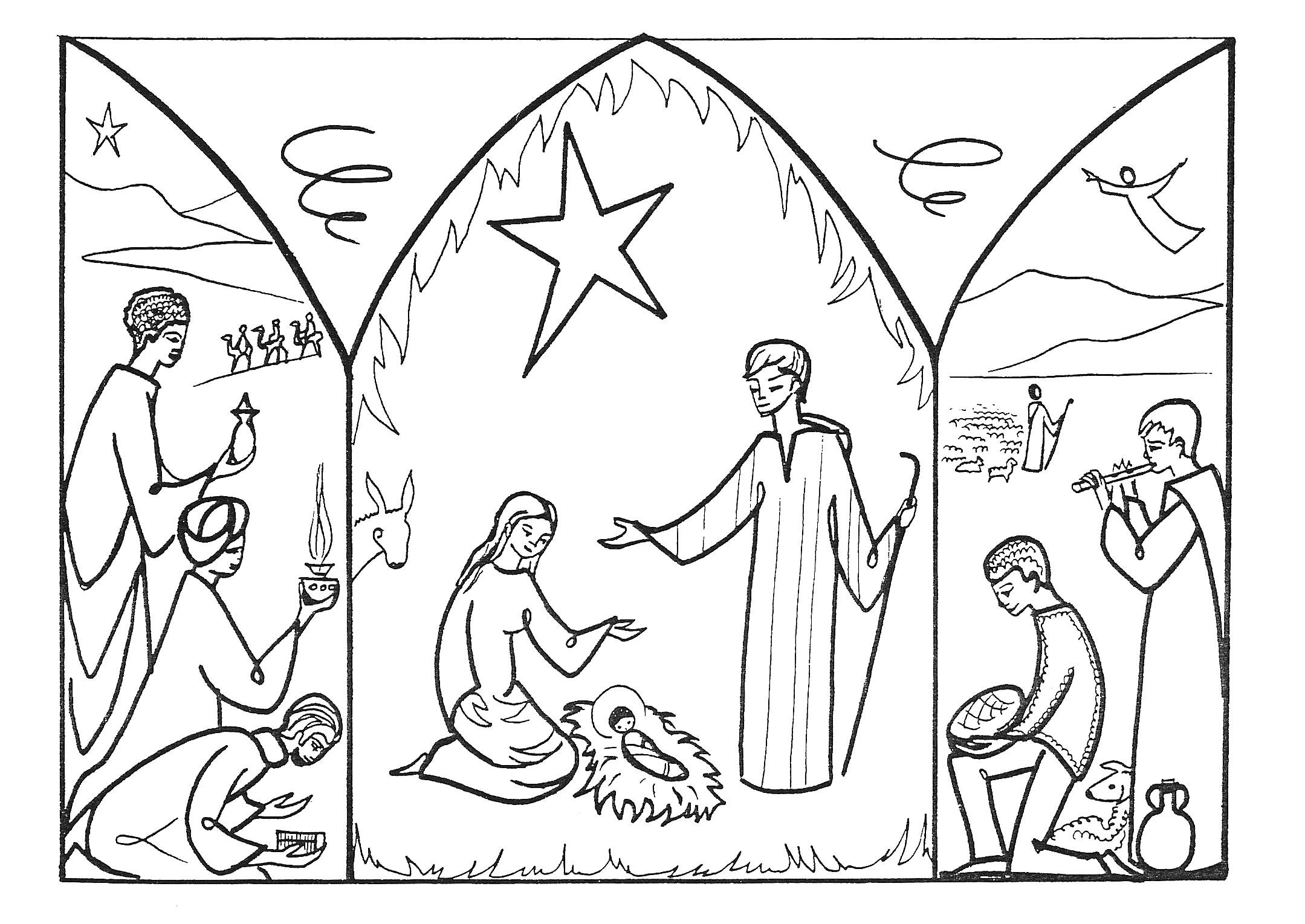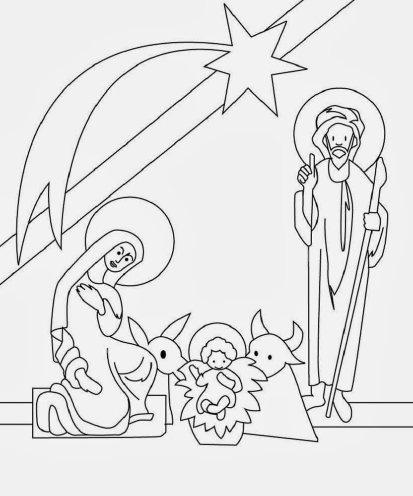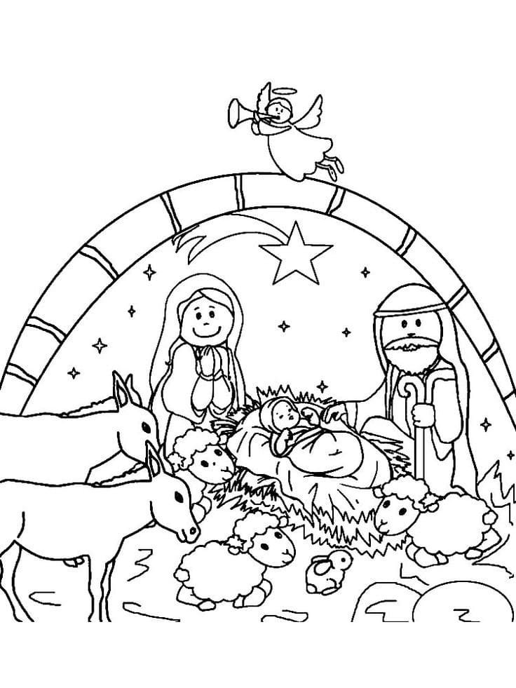 ![Мария, Иосиф и младенец в вертепе раскраска]()