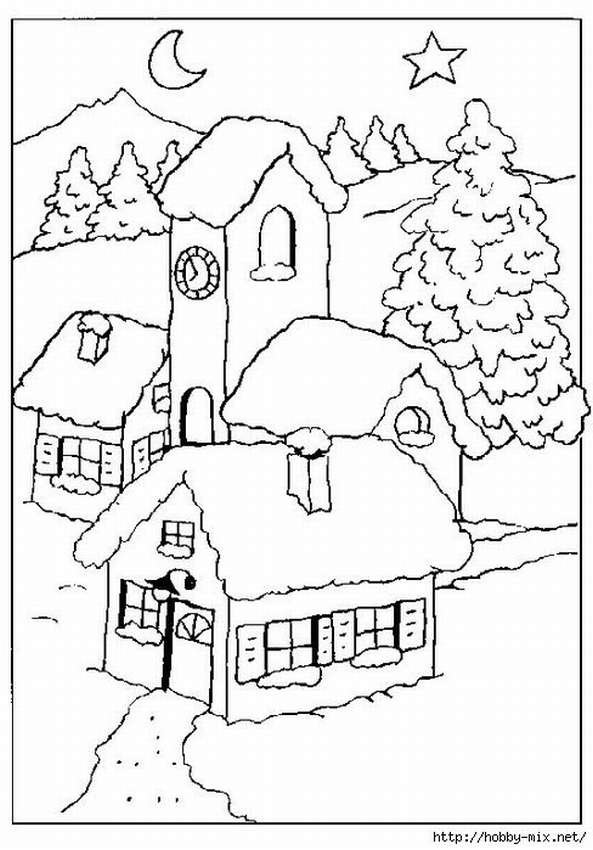 ![Зимняя деревня раскраска]()