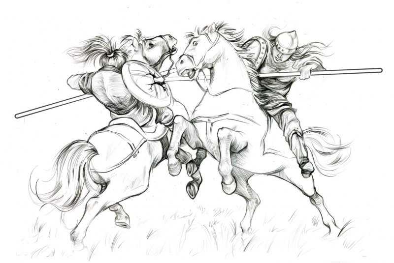 ![Раскраска Куликовская битва Пересвет и Челубей]()