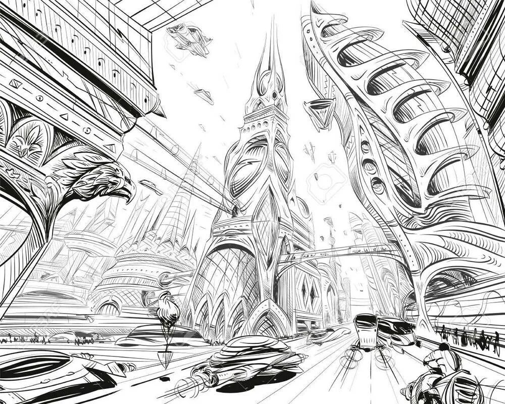 ![Город будущего раскраска]()