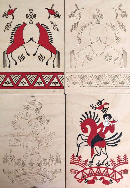 Мезенская роспись олени и птицы