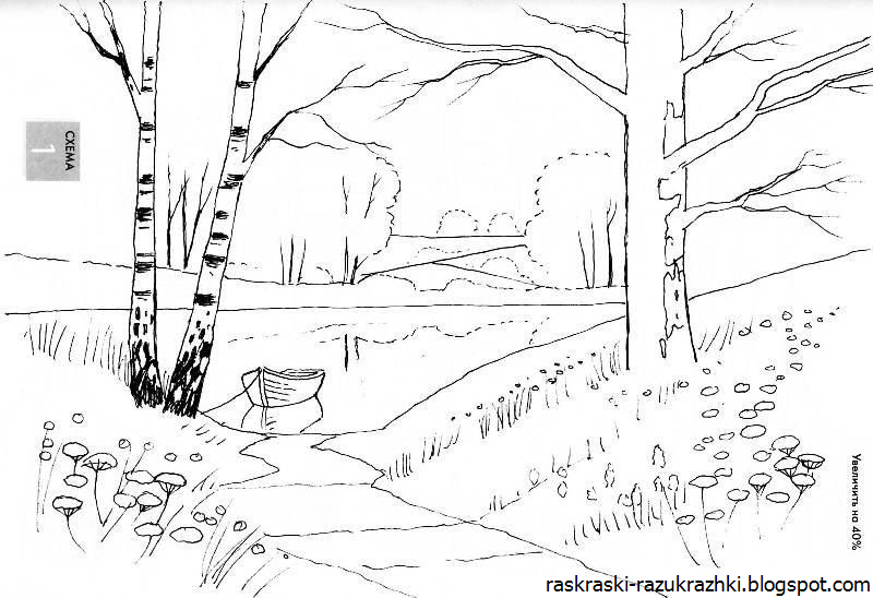 ![Весенний пейзаж раскраска]()
