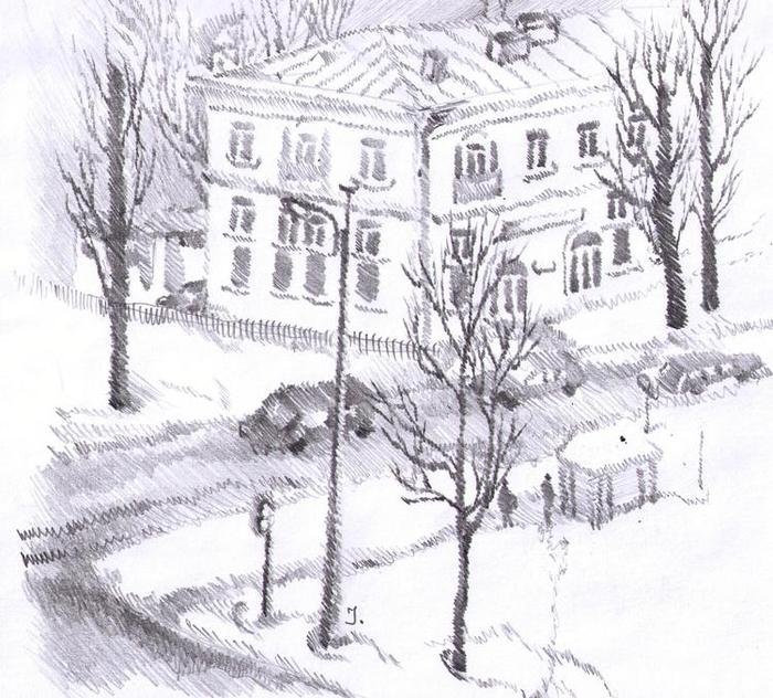 ![Зимний городской пейзаж карандашом]()