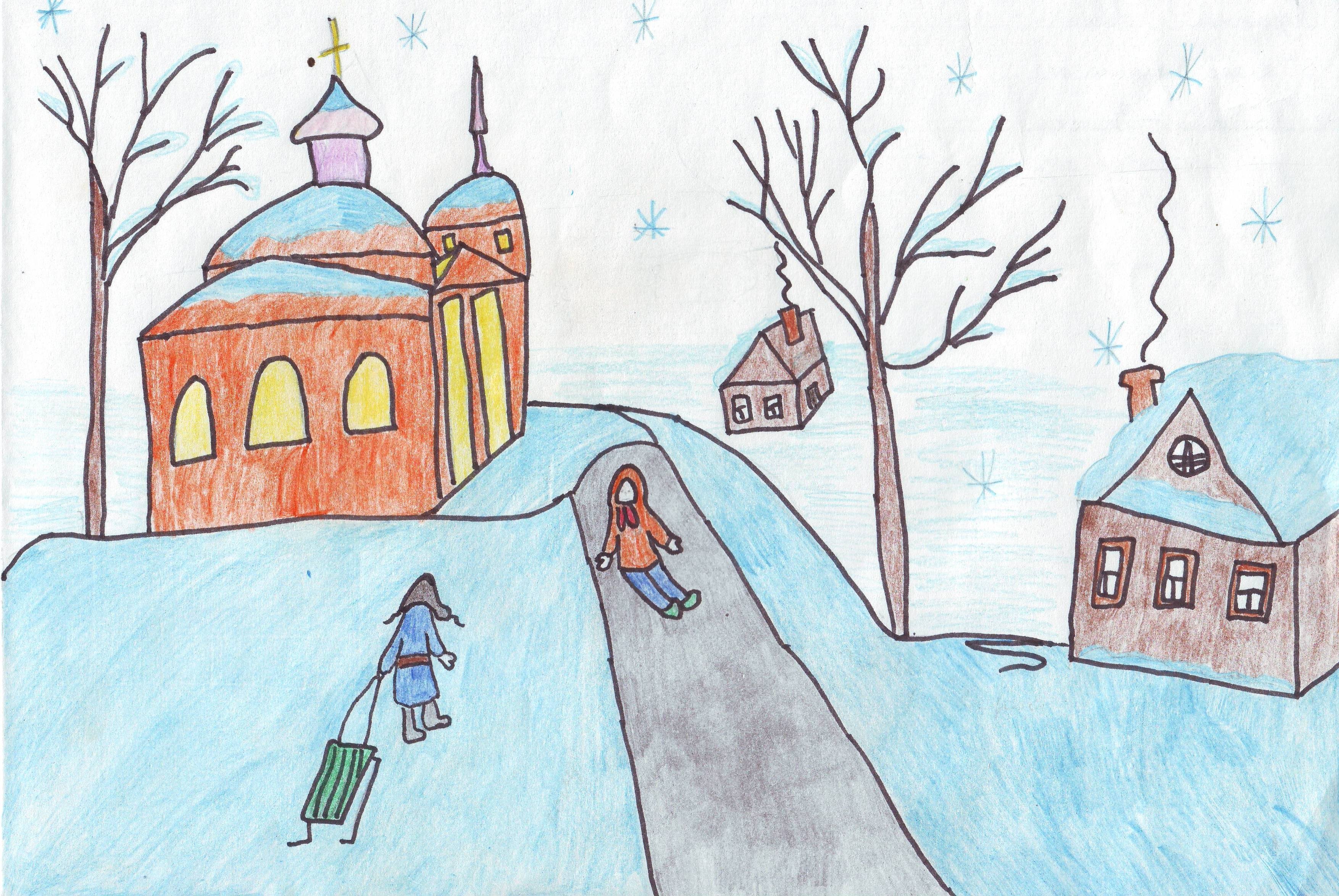 Зимний город рисунок детский