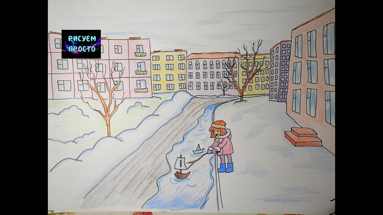 ![Зимний город рисунок детский]()