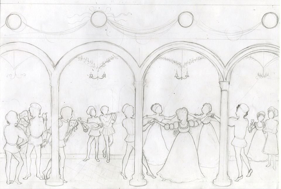 ![Набросок сцены с декорациями]()