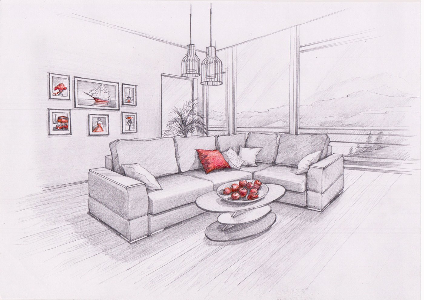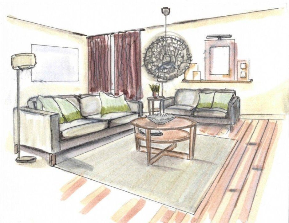 Эскиз гостиной карандашами для начинающих