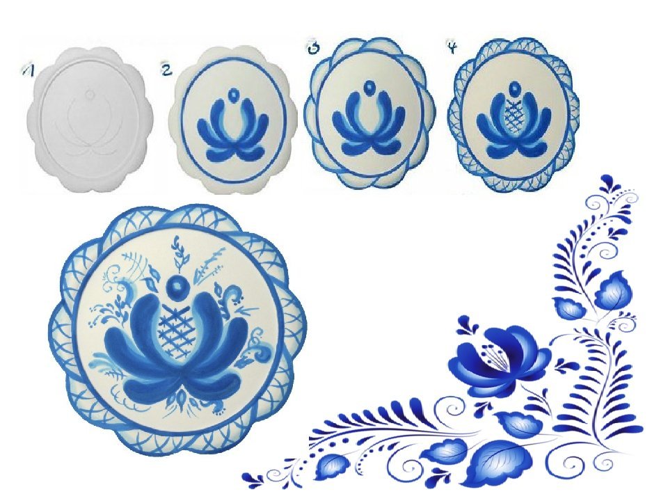 ![Этапы росписи тарелки Гжель]()