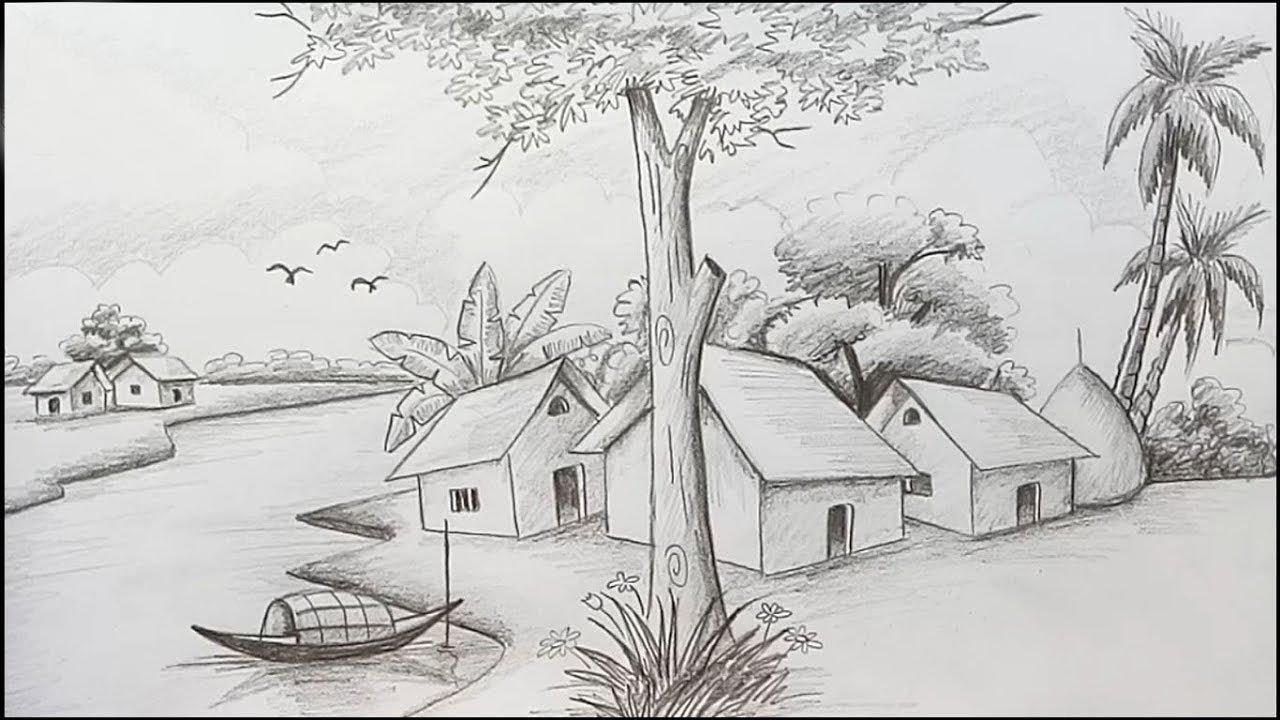 ![Сельский пейзаж карандашом для начинающих]()