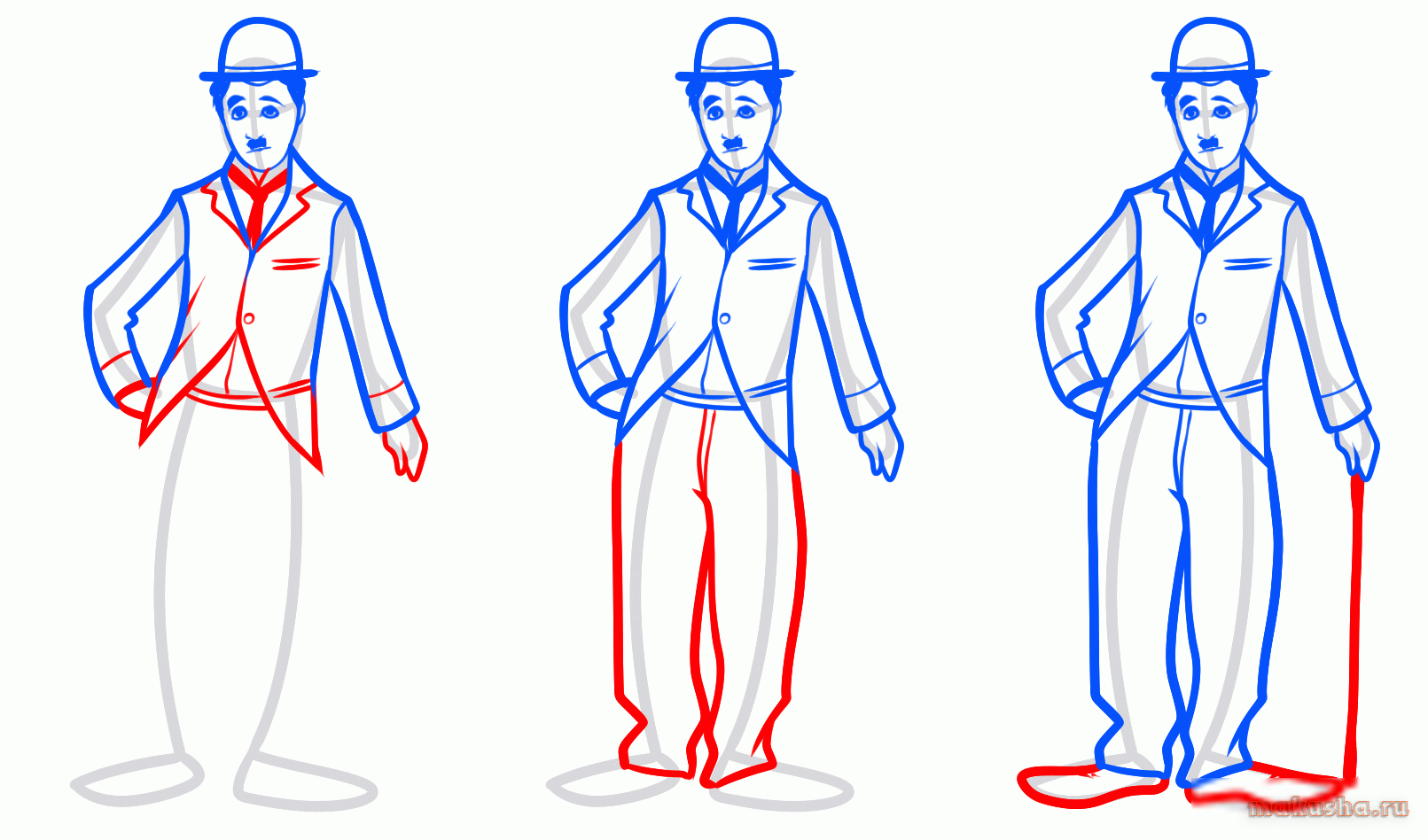 ![Чарли Чаплин поэтапно]()