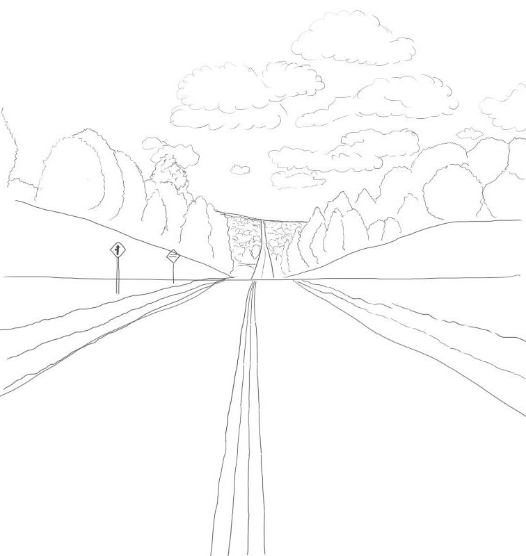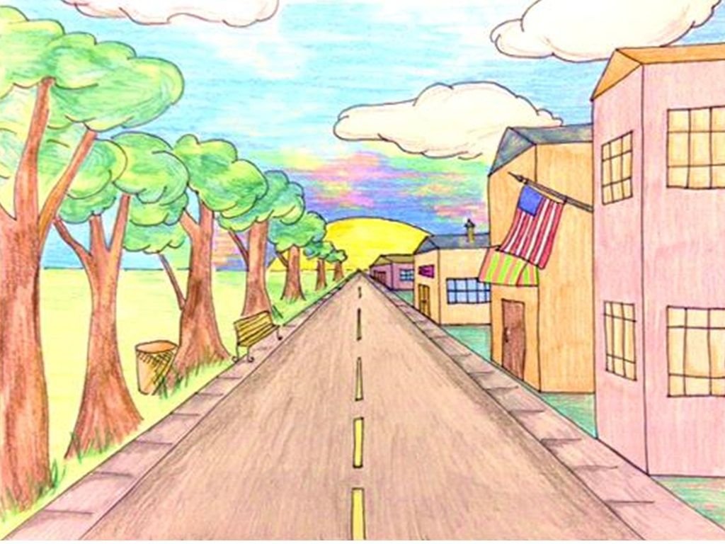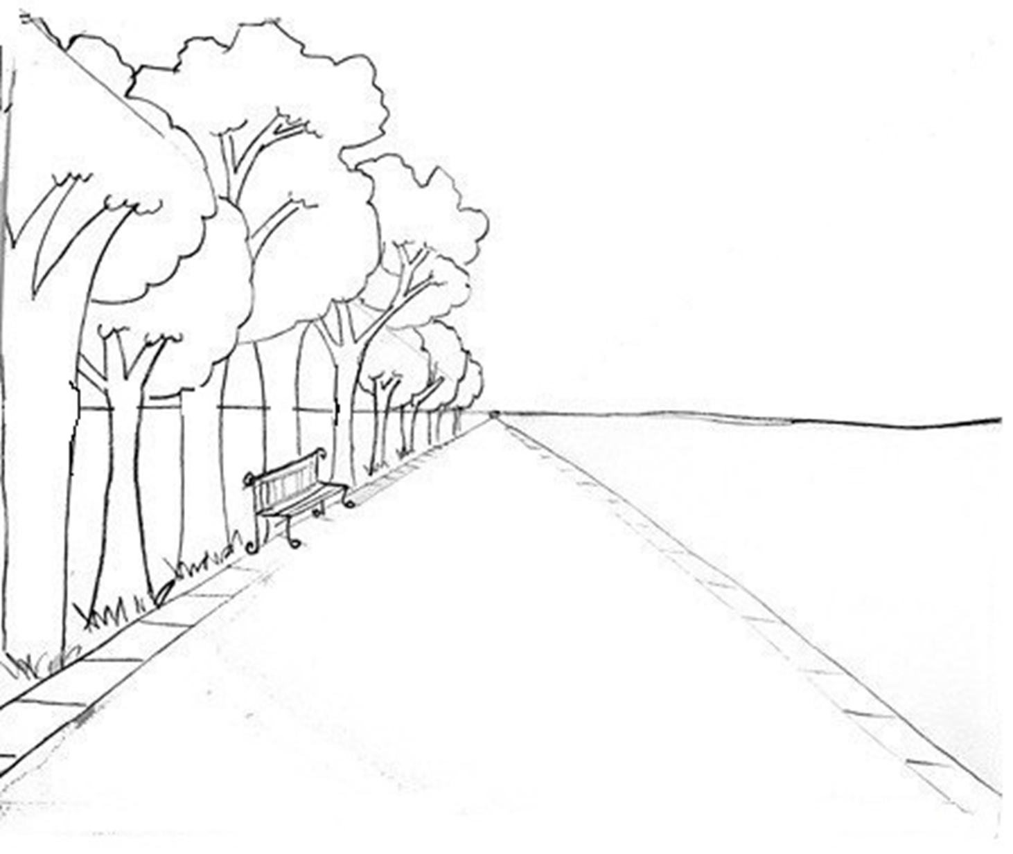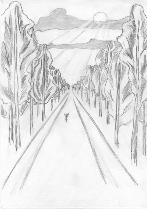 ![Линейная перспектива (дорога, столбы, дома), карандаш]()