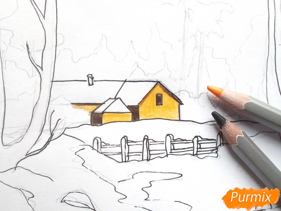 Зимний пейзаж цветными карандашами