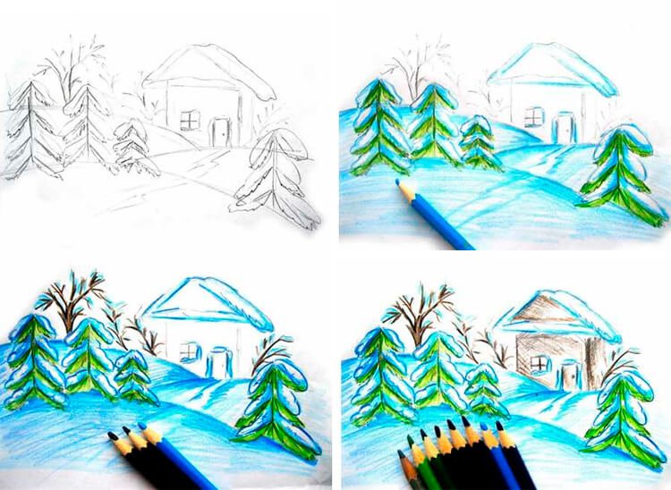 Этапы рисования зимнего пейзажа