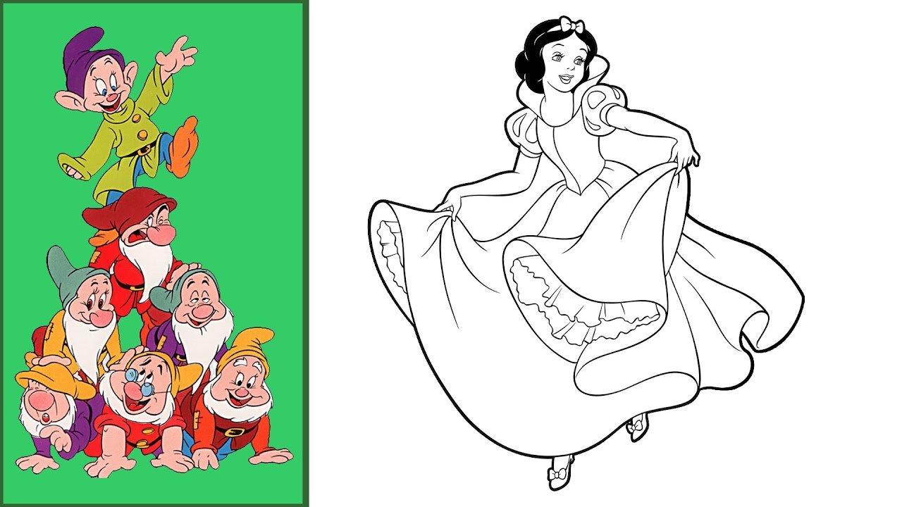 ![Белоснежка и семь гномов раскраска для детей]()