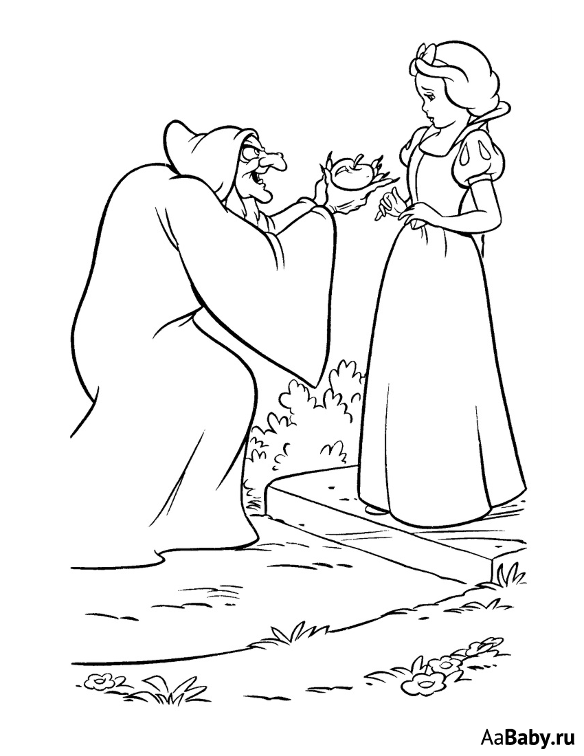 ![Белоснежка с яблоком раскраска]()