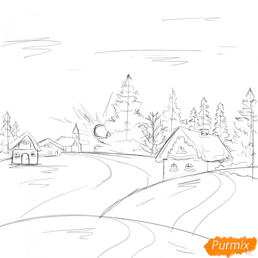 ![Зима в деревне рисунок карандашом]()