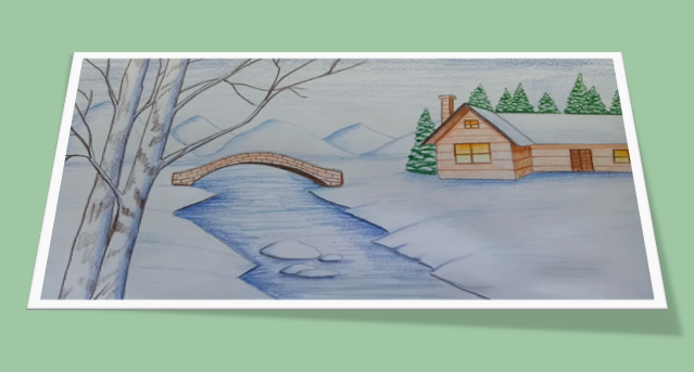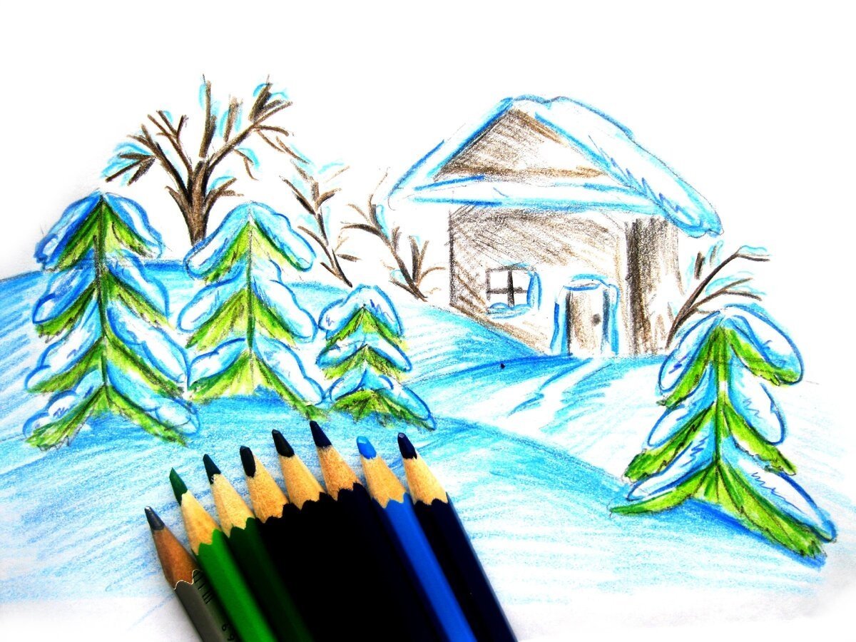 ![Зимний пейзаж цветныекарандашами]()