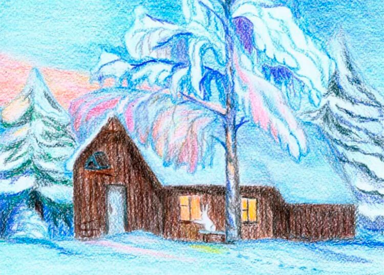 ![Зимний пейзаж цветными карандашами]()