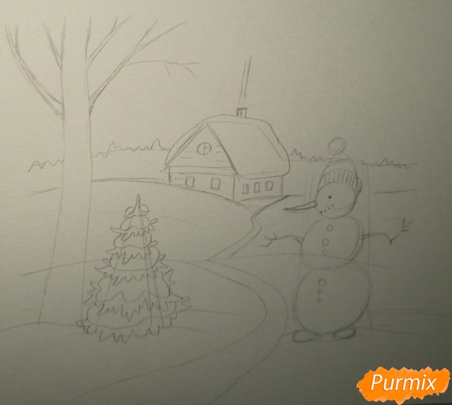 ![Зимний пейзаж поэтапное рисование карандашом]()