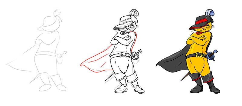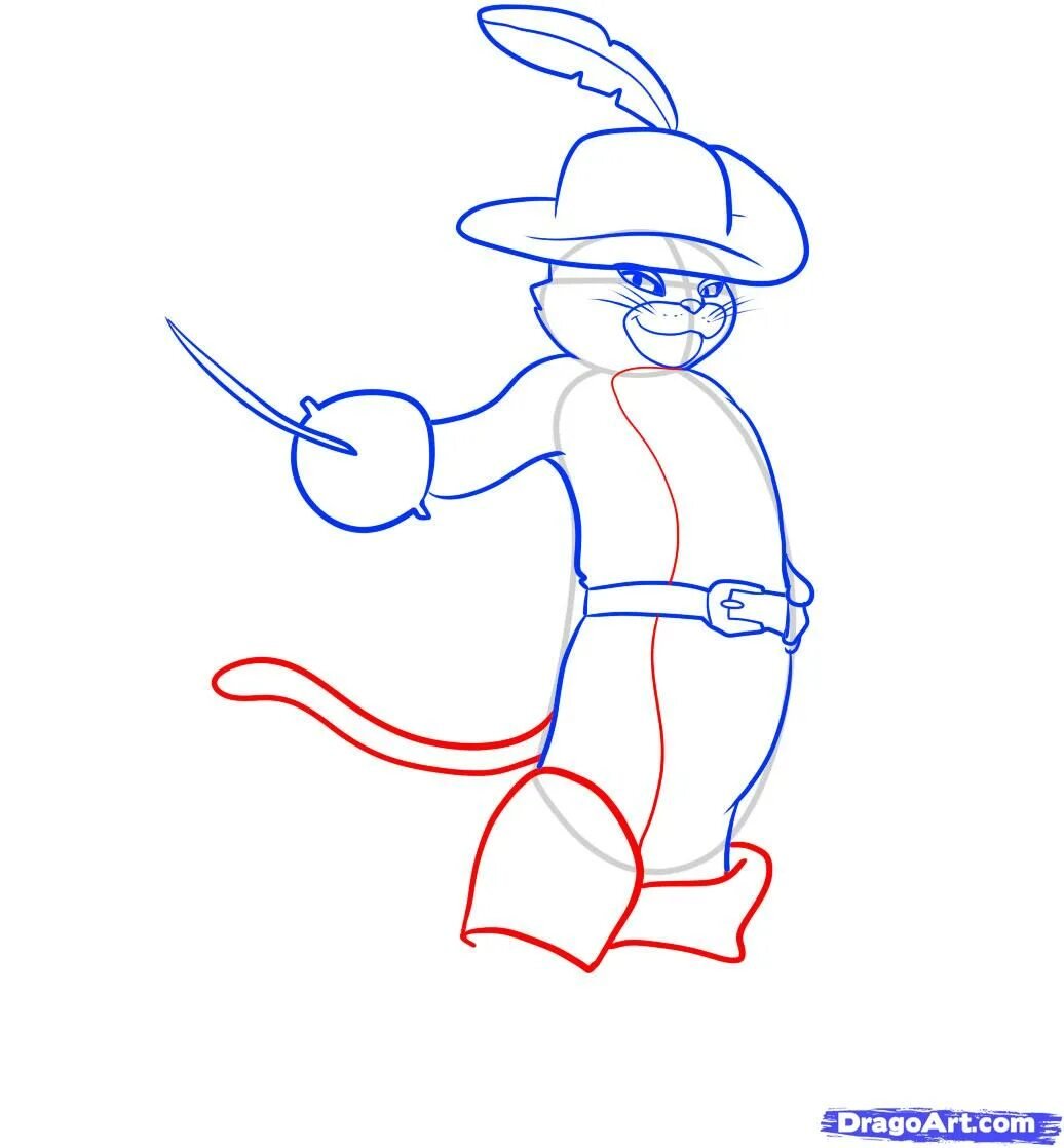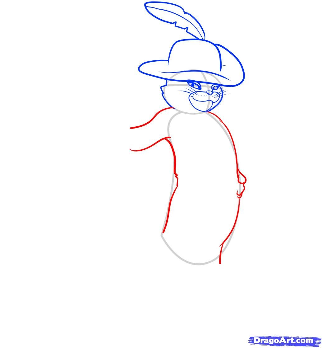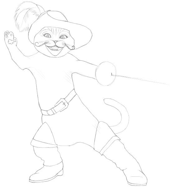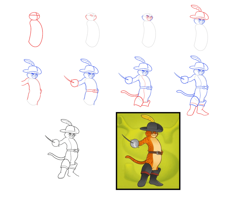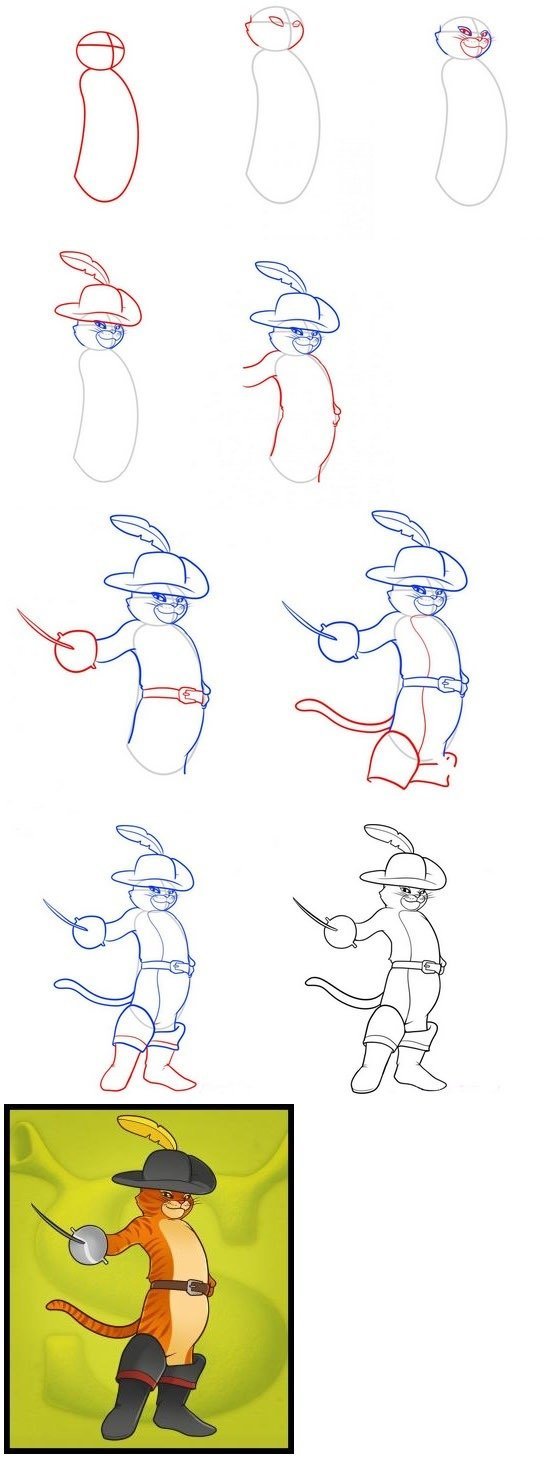 Пошаговый рисунок кота в сапогах