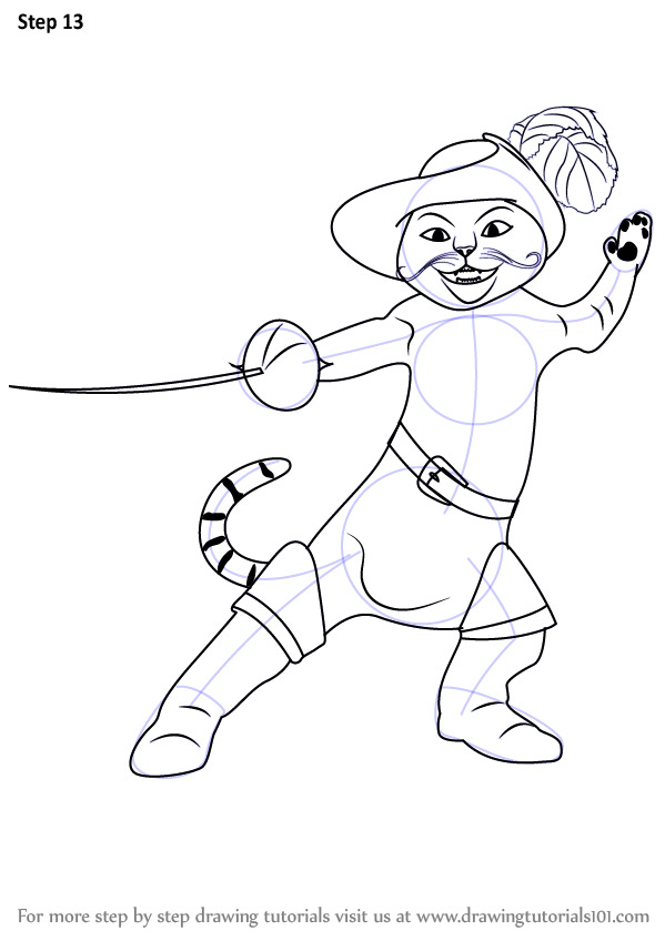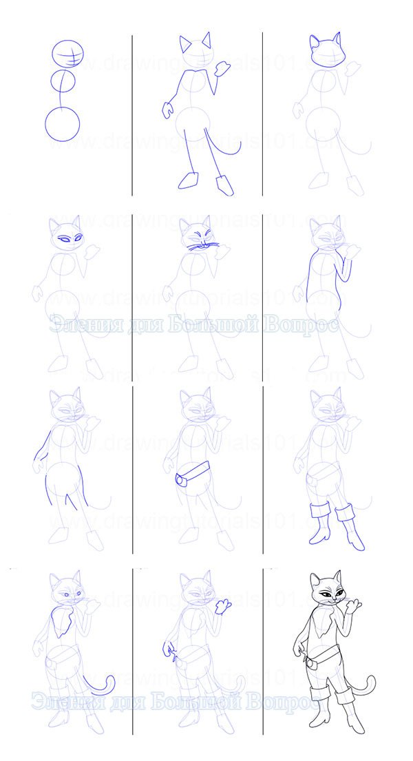 ![Пошаговый рисунок кота в сапогах]()