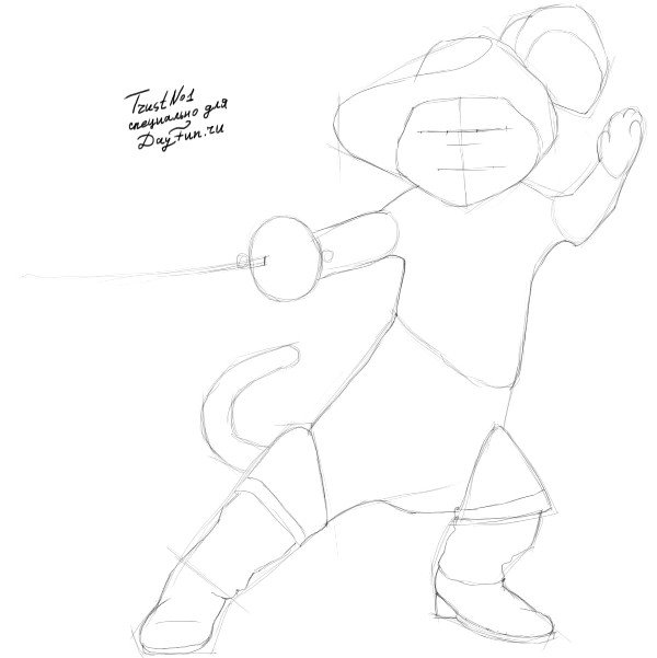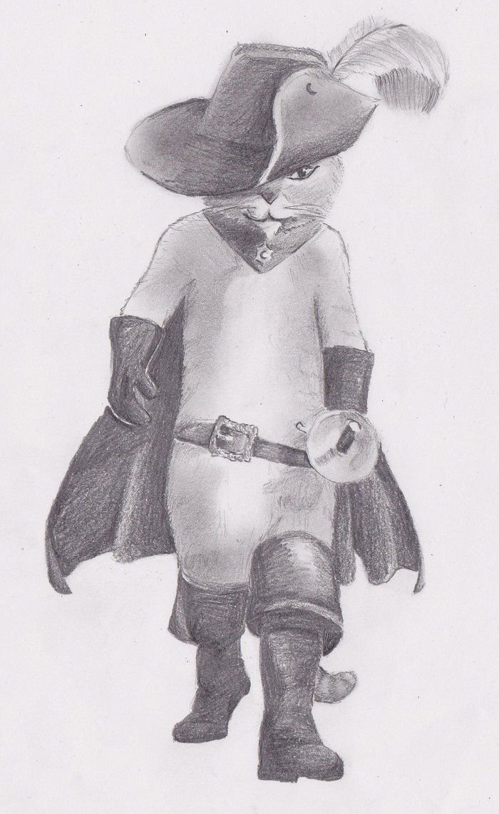 ![Кот в сапогах рисунок карандашом поэтапно]()