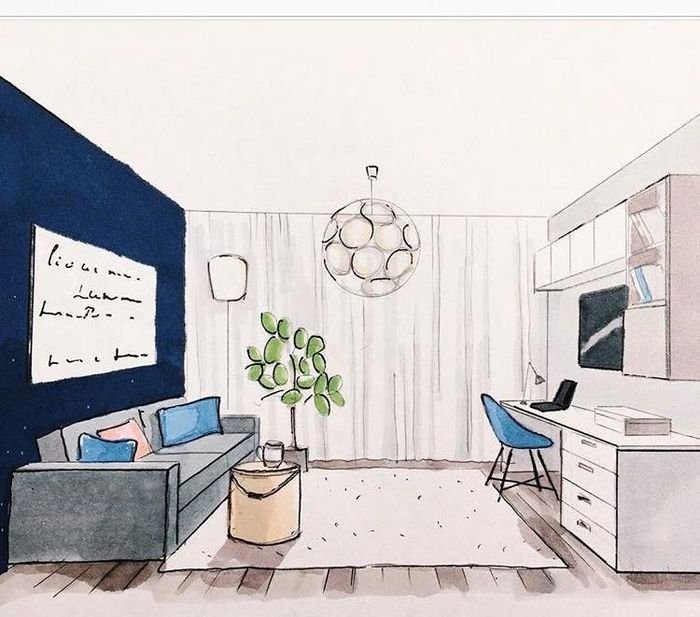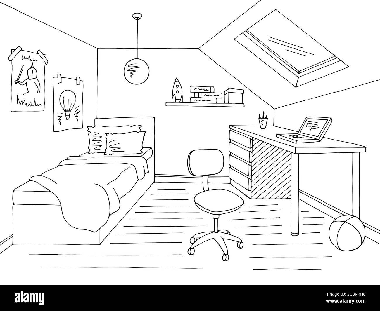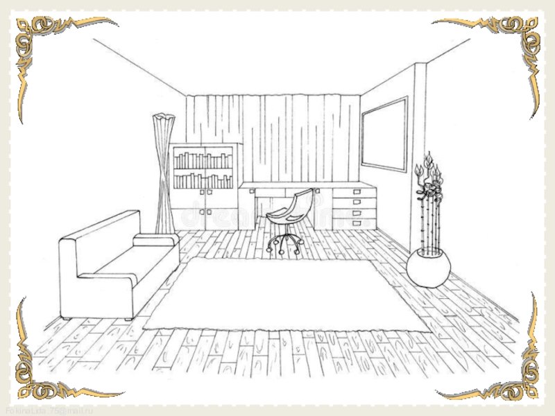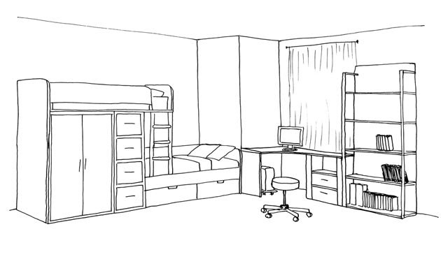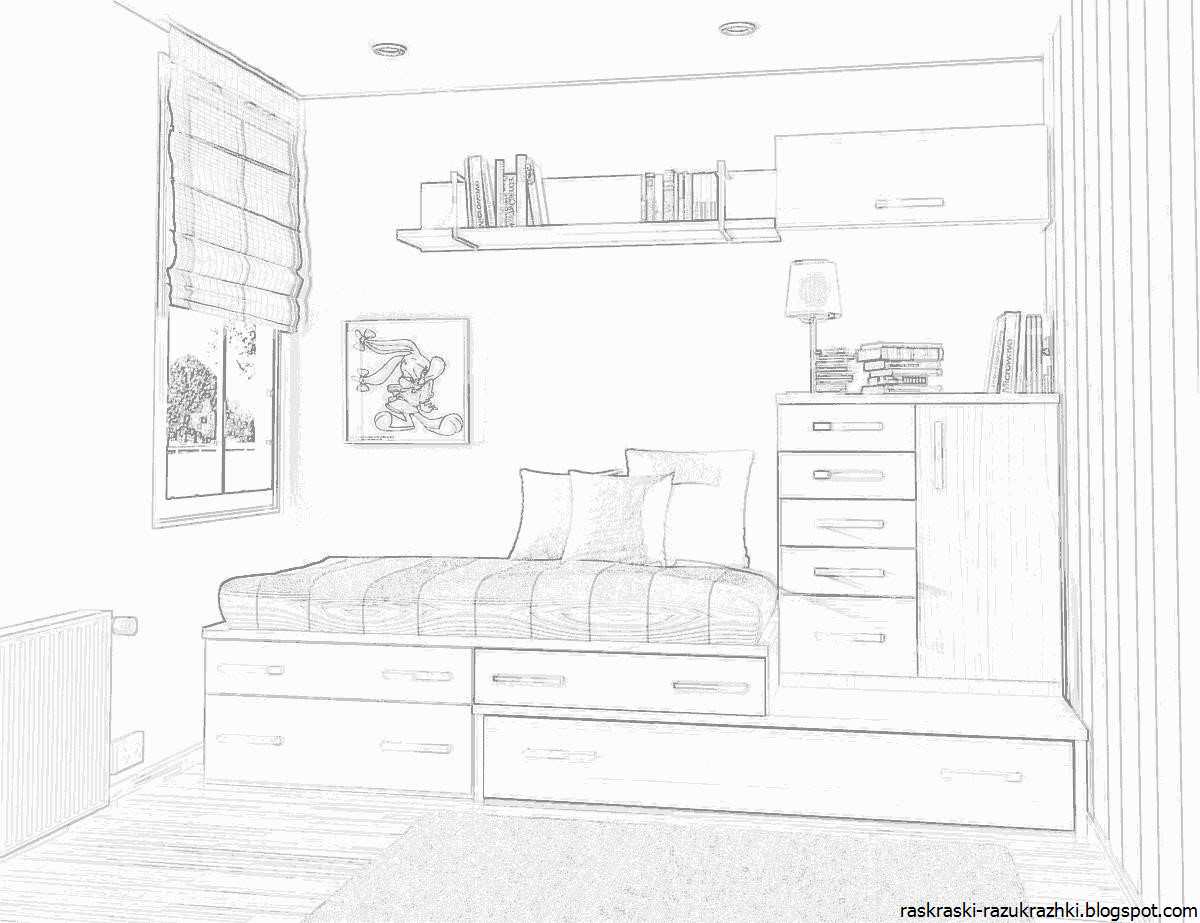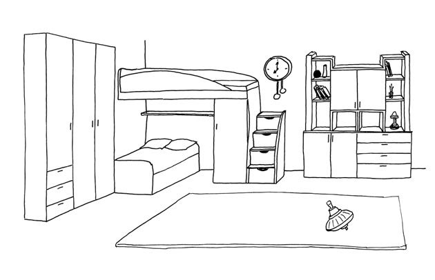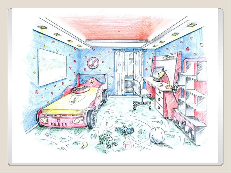 ![Рисунок детской комнаты в перспективе с мебелью]()