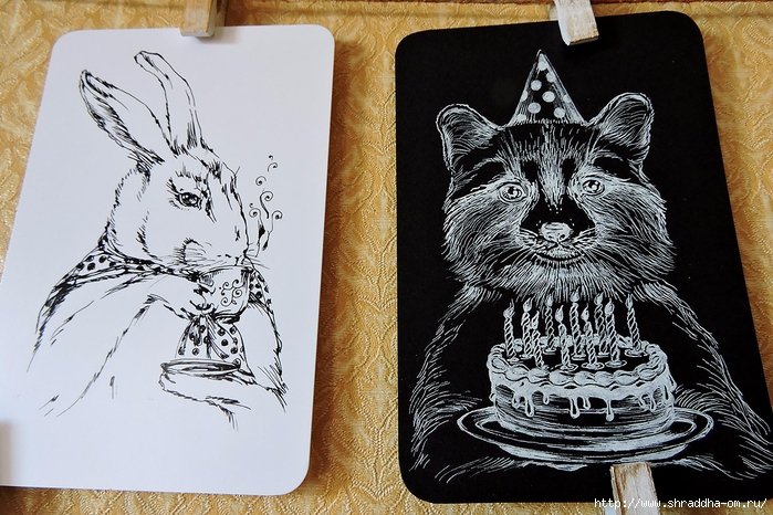 ![Рисунки на чёрном листе белой ручкой]()