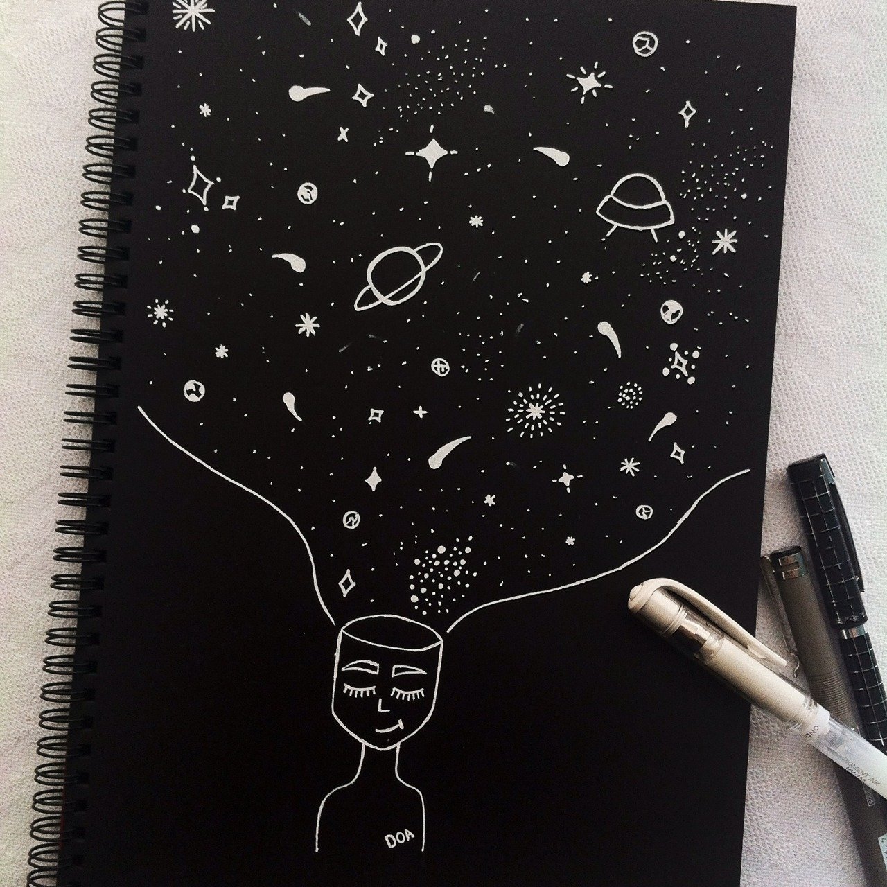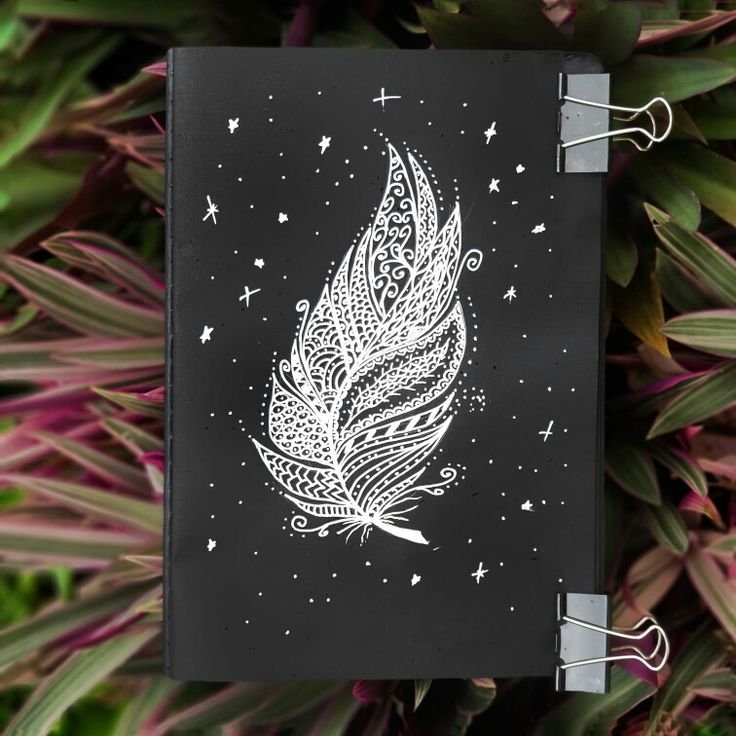 Рисунки в чёрном скетчбуке белой ручкой