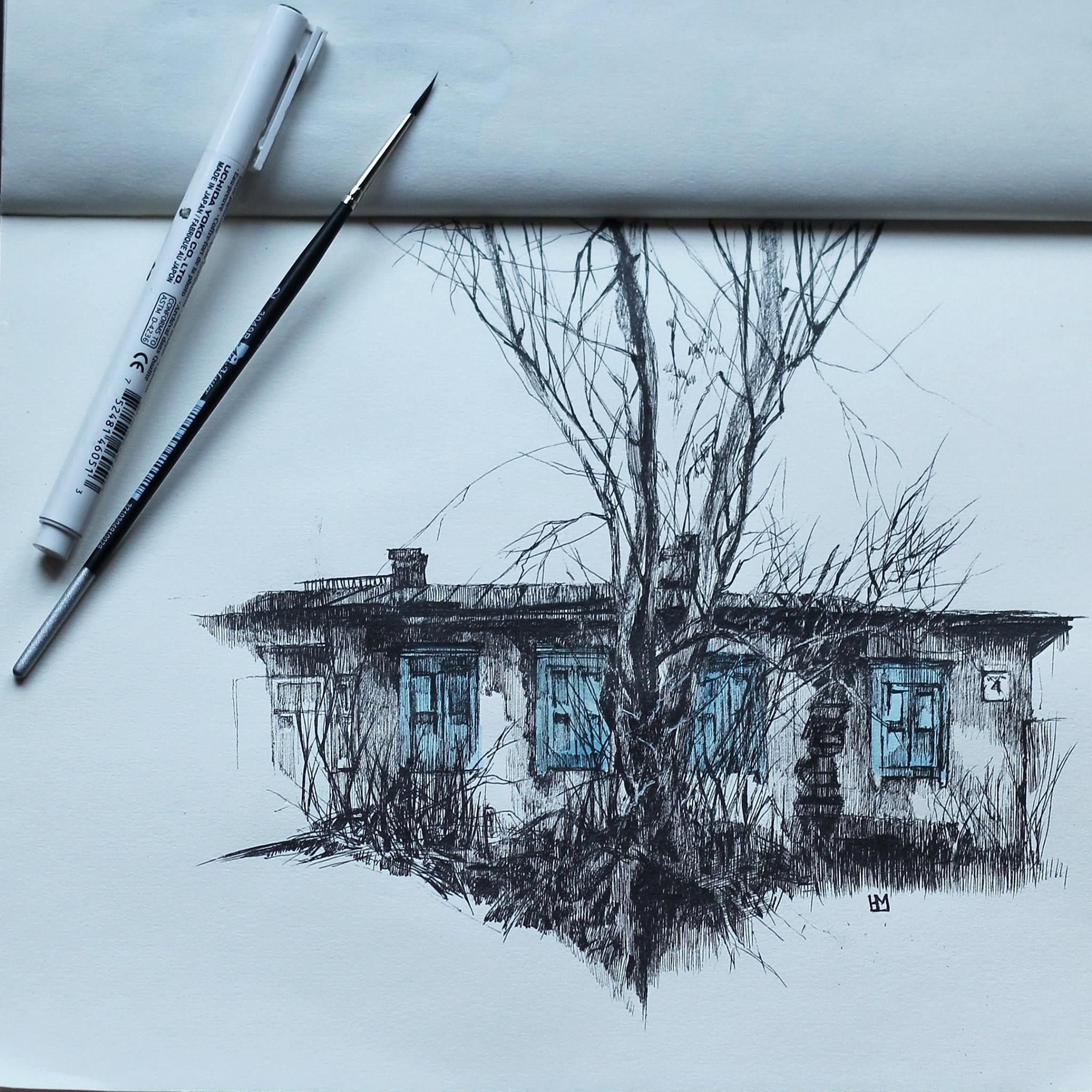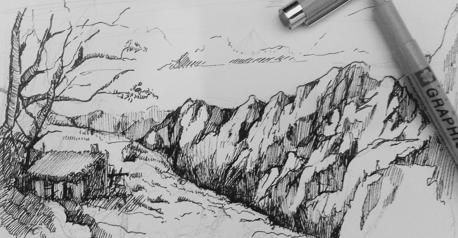 ![Пейзаж чёрной гелевой ручкой]()