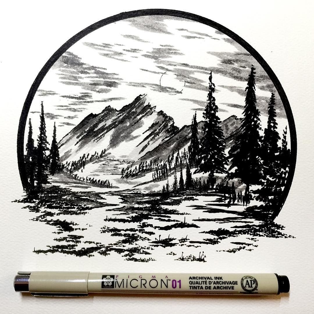 ![Пейзаж черной ручкой]()