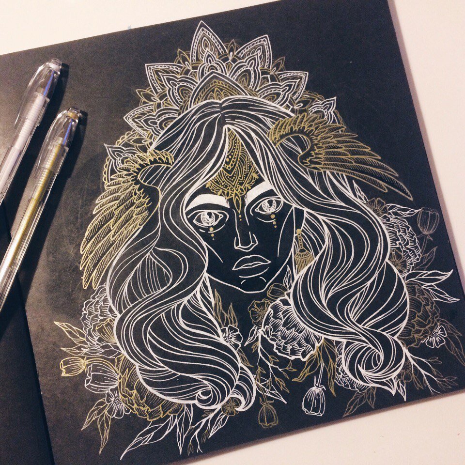 Скетч на черной бумаге белой ручкой
