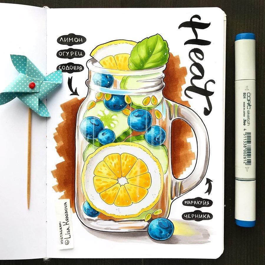 Рисунки в скетчбуке маркерами еду