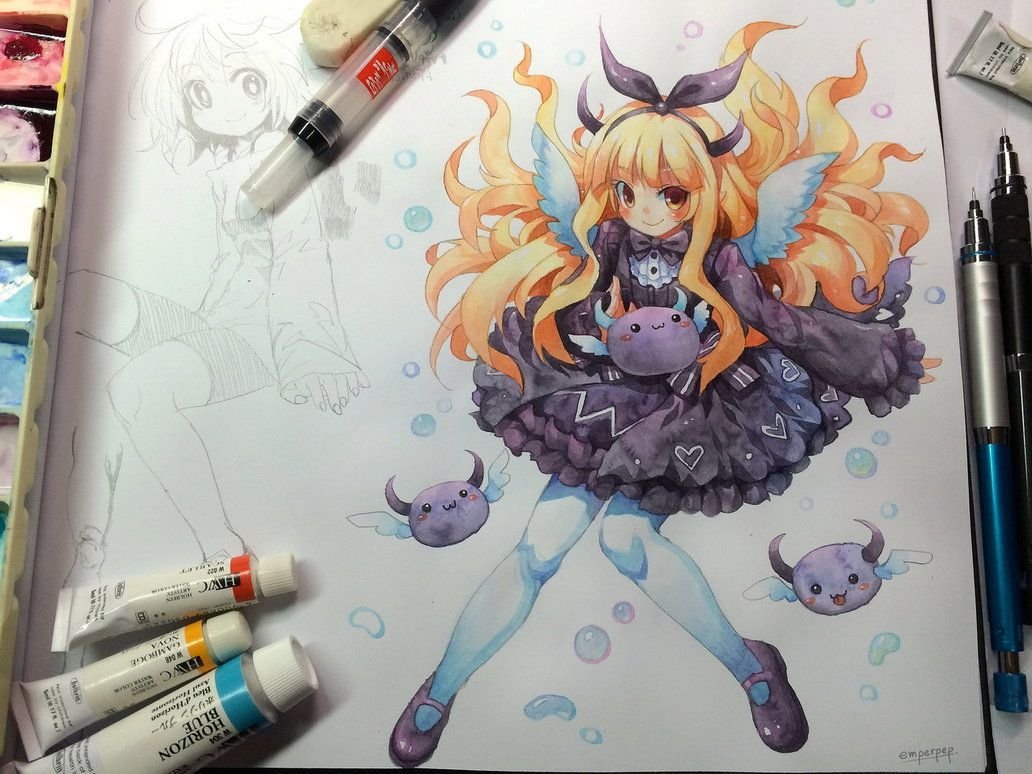 ![Аниме акварельными карандашами]()
